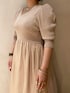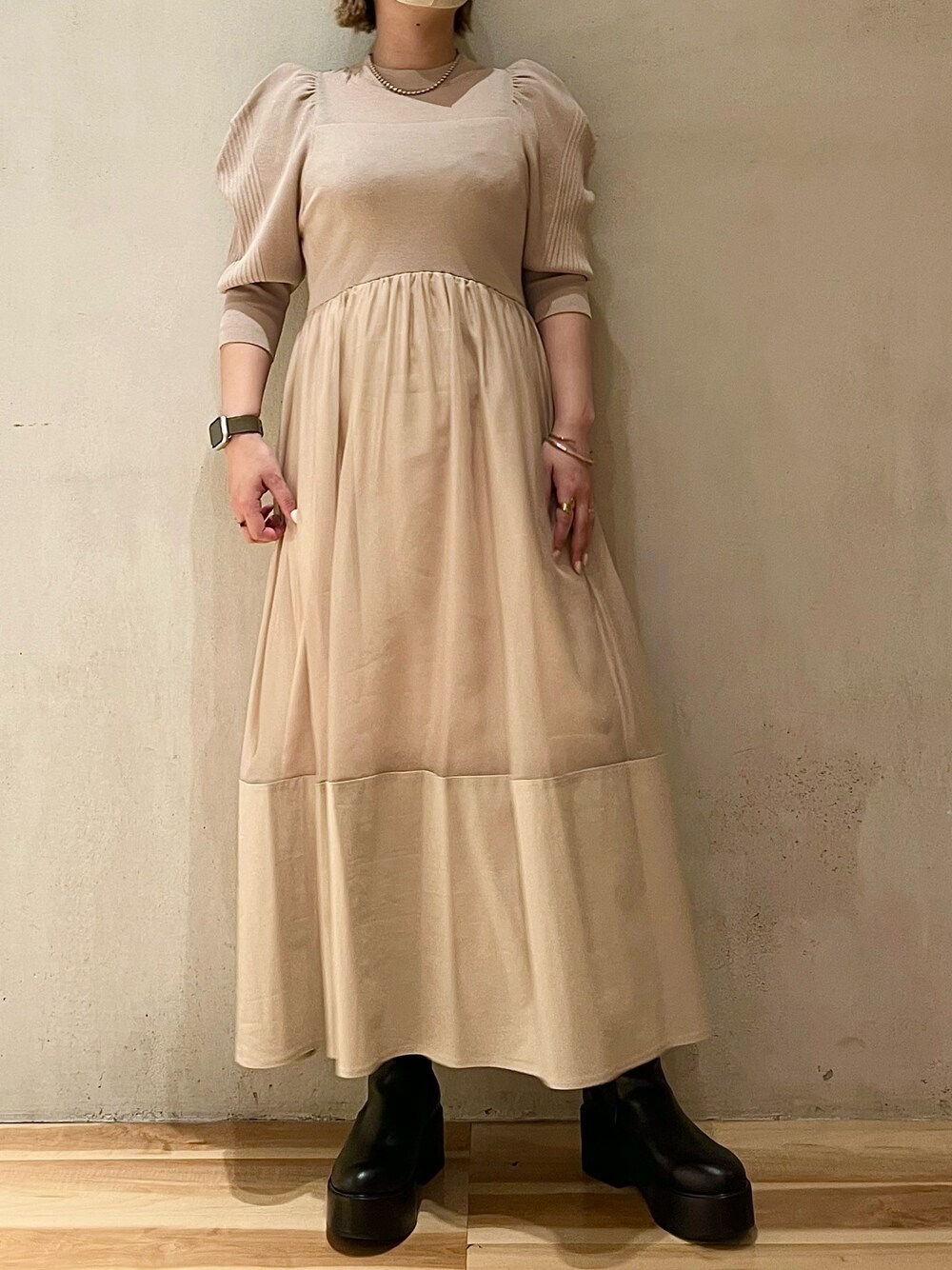 《モードエレガンスなレディワンピ》 【ワンピース】 ELENDEEKのワンピースといえば、のフィット&フレアシルエット。高めのウエスト位置とほどよいフレア感で着るだけで細見えが叶う1枚、、、☺️ウエストはぐるっと一周柔らかいゴムで着心地らくらく。トップス部分はほどよい透け感で大人っぽく。お袖は立体的なパフスリーブですが、肩幅が強調されないように計算されたデザインです◎柔らかなベージュが女性らしく、あえてゴツめのブーツを合わせたスタイリングが好き!155cm01サイズ着用。 【ネックレス】 ボールチェーンネックレスをレディなワンピースに合わせてカジュアル見えでつけるのもオススメ♡