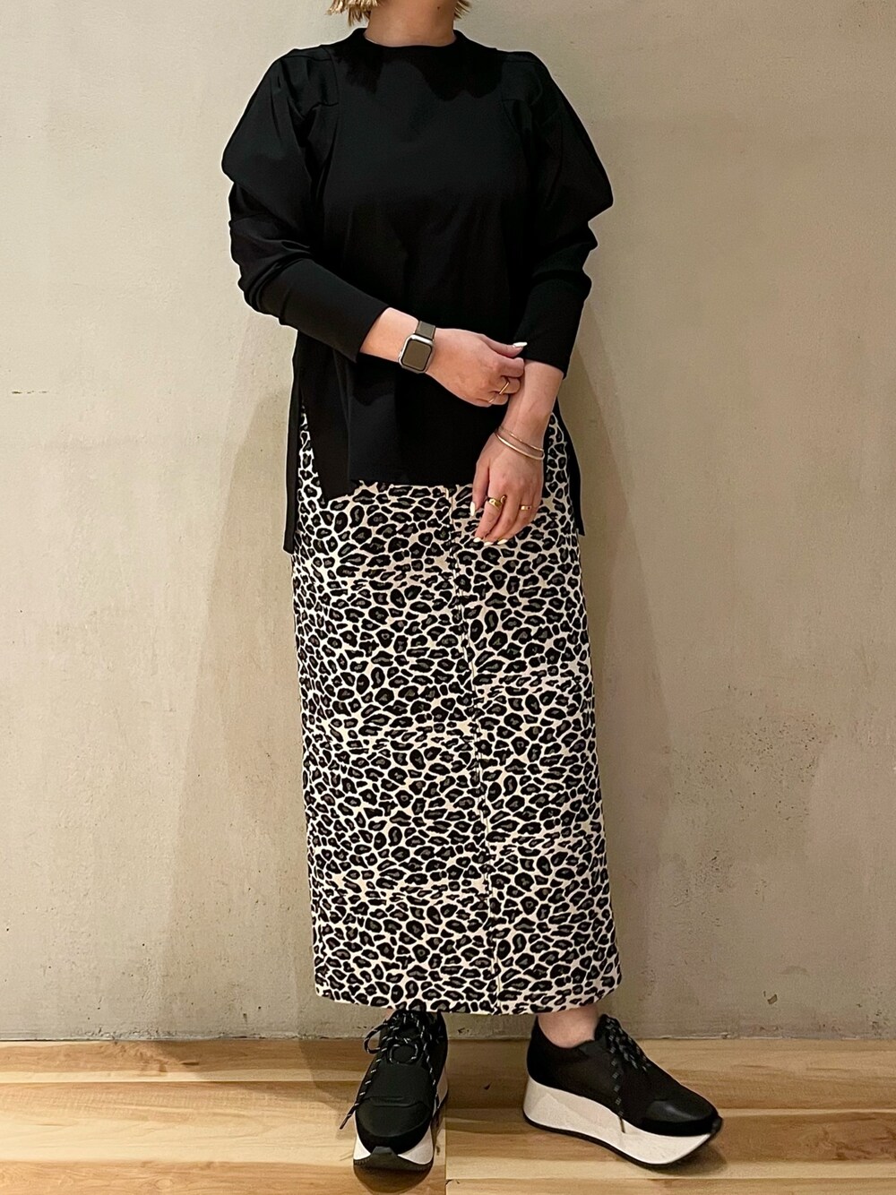 《秋のモードスタイル》 【トップス】 キレイめのジャージー素材のトップス。カジュアルになりがちなカットソーも、ショルダー部分の繊細なデザインでモードな印象に♡柔らかい生地で着心地さらさら。季節の変わり目にストレスフリーでお召しいただける1枚です!お丈もお尻が隠れるくらいで安心◎インスタイルもオススメ✨ 【スカート】 柄違いのタイトスカート。着用のオフホワイトはELENDEEKお得意のレオパード柄◎しっかりめのジャガード素材で高級感があります☺️タイトスカートですが、ウエストの後ろがゴムになっており、履き心地もらくらく。後ろにスリットもあるので窮屈感無し☝️✨155cm02サイズ着用。くるぶしが隠れるくらいのお丈です! 【スニーカー】 存在感のある厚底スニーカーはスタイリングを選ばない優秀アイテム◎私は23.5cmで02サイズがジャストですが、スニーカーの甲の部分が薄めなのでゆったり履かれたい方は1サイズ上げてお選びいただくと安心です☺️厚底ですが安定感があり履き心地抜群!とっても軽いのでアクティブなおでかけにも安心です🤍