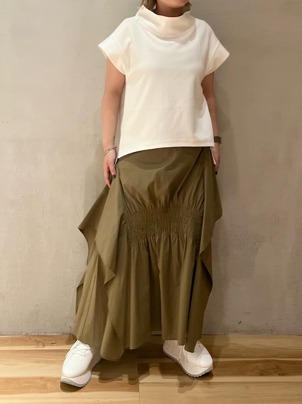 《6/8 INSTA LIVE紹介コーデ》 【カットソー】 ELENDEEK夏の定番カットソー。毎年買い足す方も多いこちらは着心地、シルエット共に抜群。ゆとりのあるハイネックなので窮屈感ゼロ。袖口が広めなので気になる二の腕もさりげなくカバーできちゃいます◎ご自宅で洗えるウォッシャブル仕様。バックスタイルのフェイクレザーテープはお取り外し可能です! 【スカート】 ELENDEEKならではのデザインスカートは履くだけでモードエレガンスが完成◎ボリュームを抑えながらもサイドのラッフルデザインが際立ちます。一見タイトめに見えますが裾のシャーリングが伸縮するので歩きやすく窮屈感ゼロ◎155cm02サイズ着用。ご自宅で洗えるウォッシャブル仕様です♡ 【シューズ】 大人気の厚底スニーカー。靴紐はアジャスタータイプなので解ける心配もなく着脱もらくらく◎片手で楽に履けるのでママさんにもオススメです!私は普段23.5cmでジャストで履くなら02サイズですが、ややゆとりを持って履きたいので03サイズをチョイス✔︎つま先が薄いタイプなので足の甲が高めでサイズが心配な方は1サイズ上げて中敷で調整していただくのもオススメです!