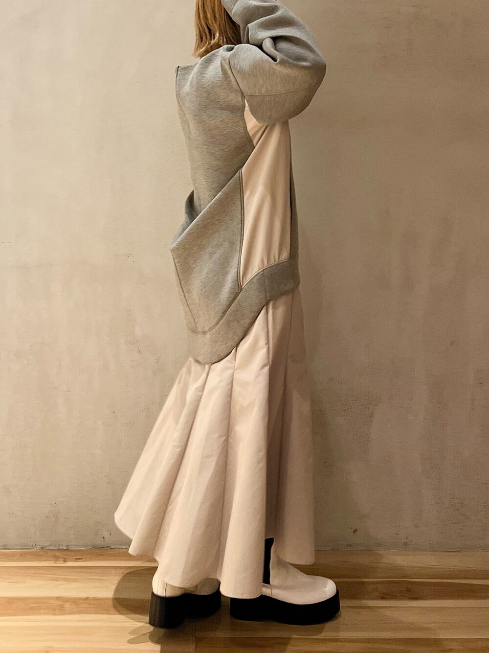《モードカジュアルがお好きならこれ!》 【ワンピース】 やわらかで弾力のあるジャージー素材とタフタ素材をドッキングしたワンピース。ラインを拾わないゆったりシルエットで着心地抜群。なのにごわつかず、スラリと縦のラインが強調され華奢見え効果も◯裾のマーメイドシルエットが女性らしく、カジュアルすぎない大人なデザインです!155cm02サイズ着用。わたしは02サイズでゆるくズルッと着るのが好き♡ 【ブーツ】 厚底のサイドゴアブーツ。ソールは約6cmですが歩きやすく履き心地抜群♡牛革なので履けば履くほど馴染みより履きやすくなります!サンプルの為38サイズ(24-24.5cm)着用。23.5cmの私が履くとゆとりがあったので、普段通りのサイズでお選びいただくと安心です◎