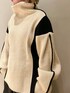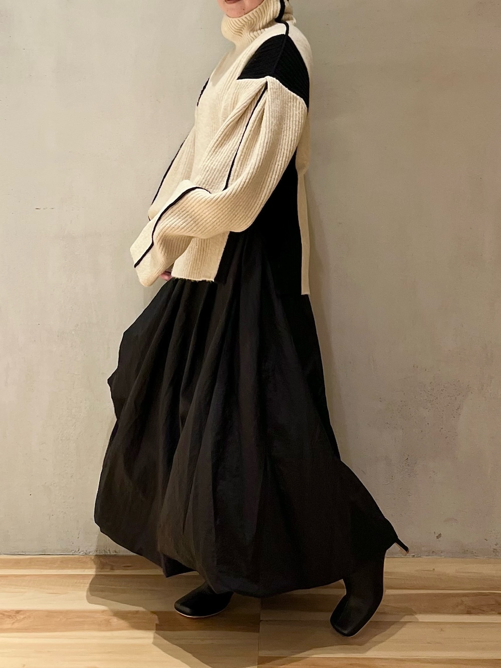 《モード好きにオススメ!ニットコーデ》 【ニット】 バイカラーデザインが目を惹くニット。ざっくりとしたオーバーシルエットとゆるいハイネックがかわいい◎シンプルになりがちなニットコーデも、ELENDEEKらしいバイカラーデザインで一気にモードな印象に。着丈はやや長めなので腰まわりもしっかりカバーできちゃいます!ゆるシルエットですが着膨れ感もなく華奢見えも叶う優秀ニットです♡ 【スカート】 目を引くバルーンシルエットのスカート。履くだけでモードスタイルが完成します◯裾がアシンメトリーになっているので重くなり過ぎず低身長さんも安心。一見ボリュームがありますが、とても軽くて履き心地もばっちり。155cm02サイズ着用。ご自宅で洗えるウォッシャブル仕様です! 【ブーツ】 柔らかな牛革を使用したオブリークトゥデザイン。オブリークトゥは足の親指から小指にかけて足の形に沿って斜めにカットされたデザインなので痛くなりにくくつま先もゆったり。ヒールは7cmで脚が1番キレイに見える高さ◎わたしは23.5cmですが幅広甲高なので38(24-24.5)を選んでゆとりを持って履きます◯