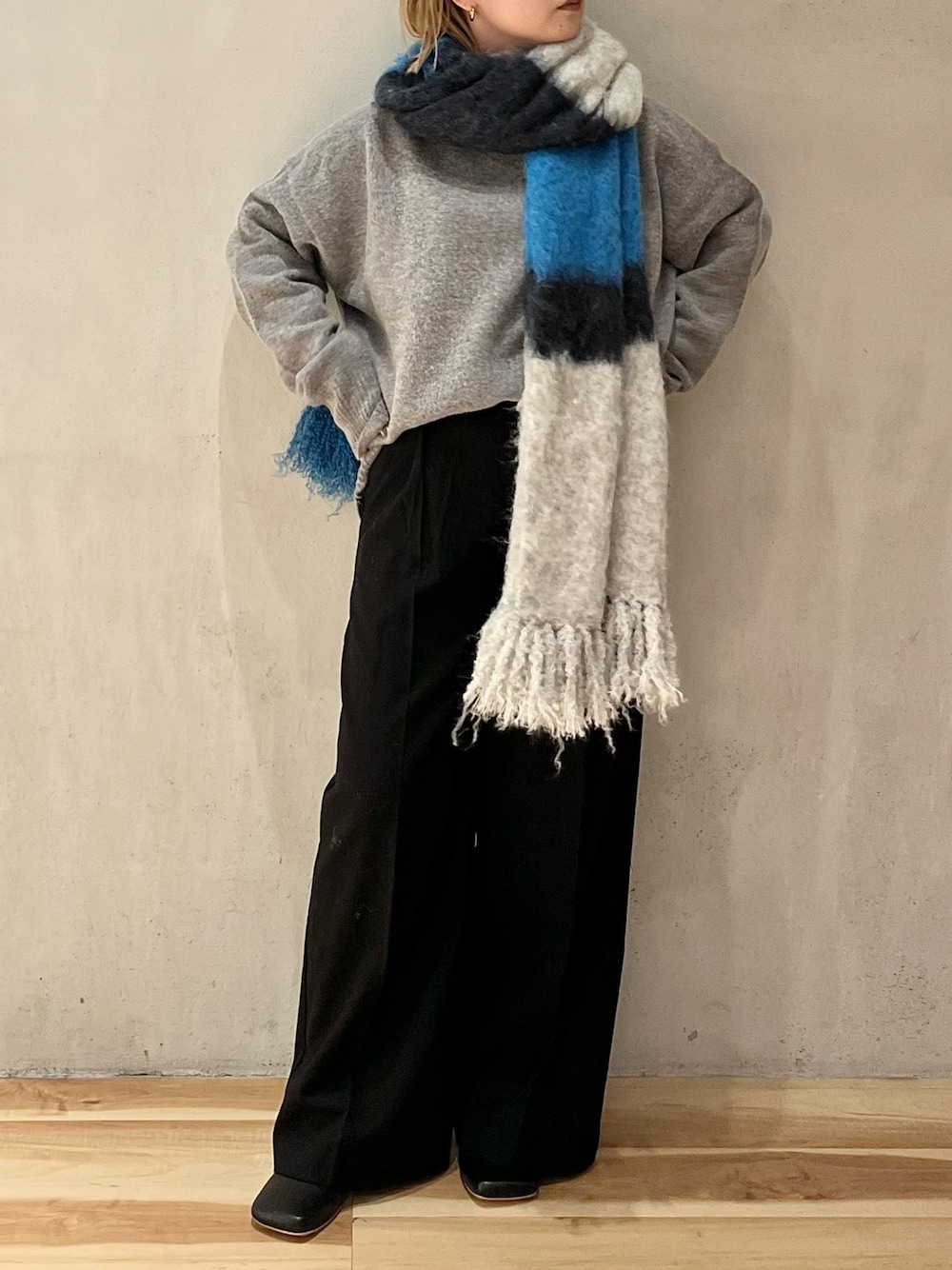 《トレンドグレーをモードに》 【ニット】 ウールが70%入った暖かニット。薄手の柔らかい生地なので着心地もよくチクチク感も気になりませんでした!ゆったりしたオフタートルが抜け感を演出。大人っぽくお召しいただけます!着丈が長めなのでアウトスタイル、インスタイルどちらも楽しめる1枚です◯ 【ストール】 ELENDEEK定番のバイカラーストール。巻き方で色の見え方が変わるのでいろんな雰囲気を楽しめます◎柔らかい肌触りがうれしい!プレゼントにもオススメです。 【パンツ】 ウールが入った暖かみのあるワイドパンツ。フレアすぎないシルエットとセンタープレスでさらりと美脚効果◎155cm/02サイズ着用です! 【ブーツ】 柔らかな牛革を使用したオブリークトゥデザイン。オブリークトゥは足の親指から小指にかけて足の形に沿って斜めにカットされたデザインなので痛くなりにくくつま先もゆったり。ヒールは7cmで脚が1番キレイに見える高さ◎わたしは23.5cmですが幅広甲高なので38(24-24.5)を選んでゆとりを持って履きます!