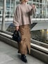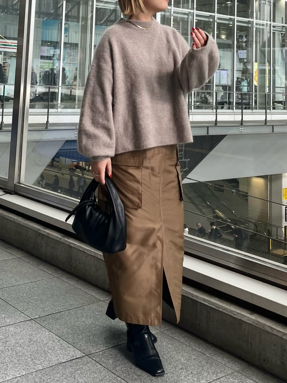《わたしのリアルバイ!しながわ服。》 【ニット】 定番人気のFOXニット。ほどよいゆったりさが抜け感を演出◎とってもふわふわで触りたくなるようなお素材。ちくちく感も心配なし。一見ボリュームがあるように見えますが、とっても軽くて薄い素材なので着心地抜群。毎年2色買いされる方も続出するニットです♡ 【スカート】 ヘルシーなワークテイストなタイトスカート。きれいめなイメージがあるタイトスカートも、サイドのポケットやタフタ素材でモードカジュアルに仕上がります!タイトですがフロントスリットで足捌き◎ボディラインを拾いにくいので安心して履けました!155cm02サイズ着用。今回はロングブーツと合わせたのでウエストをひと折して丈を少し短くして履きました!ご自宅で洗えるウォッシャブル仕様。