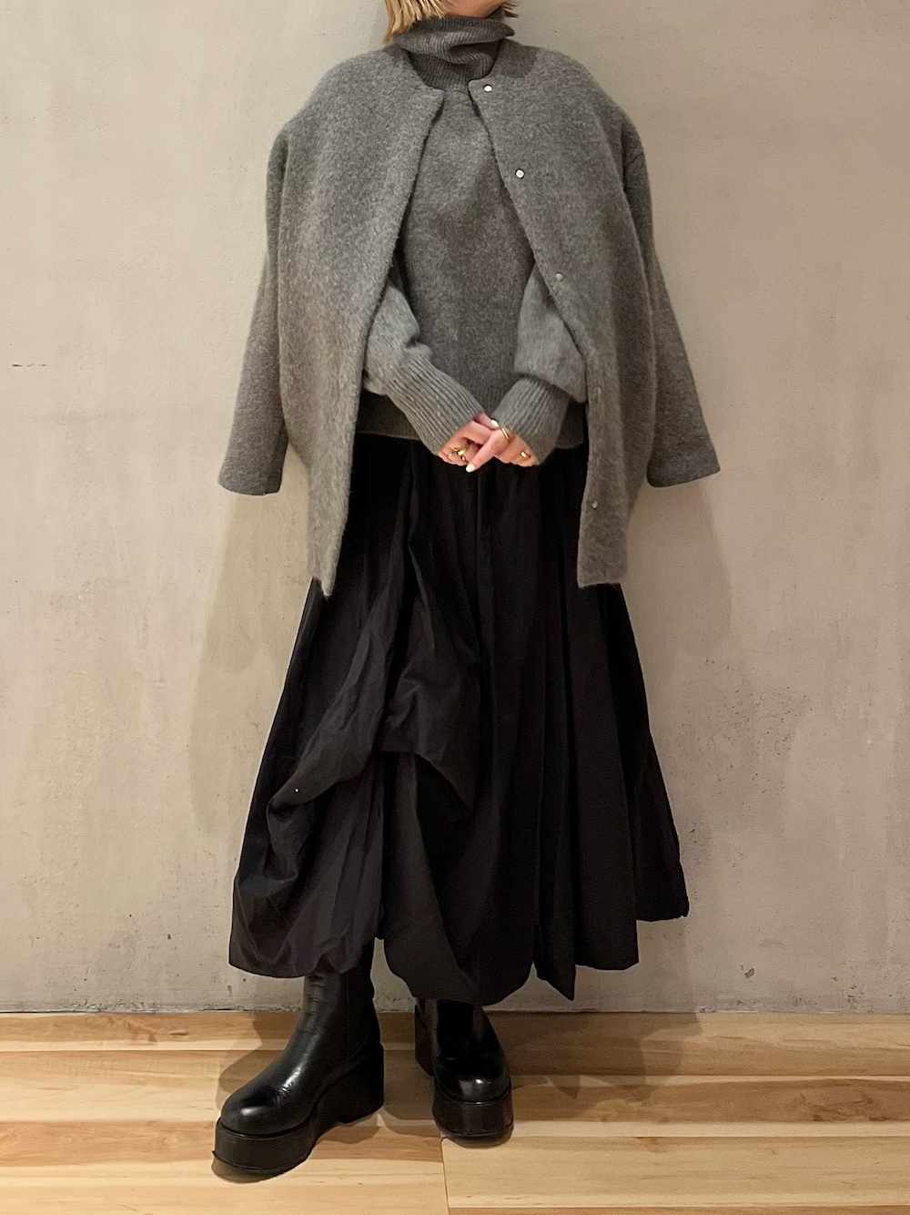 《トレンドグレーコーデ》 【カーディガン】 ELENDEEKの定番、ラクーンカーディガン。サイズが増えて2サイズ展開に。昨年までと同じサイズは01サイズ。お丈やお袖が長くなった02サイズ。今回は155cmで01サイズを着用しています!着用カラーは初登場のグレー。抜け感のあるラフなカジュアルスタイルからモードスタイルまで幅広く使えるカラーです◎ラクーンならではのふんわりとしたお素材と、軽くて暖かな着心地。夏以外の3シーズン着られる優秀アイテムです。 【ニット】 大人気のラクーンカーディガンシリーズからプルオーバーニットが登場しました!ふわふわでちくちく感なし。安心して着られる1枚。ボトムを選ばない着丈、シルエットなので、ラクーンカーディガンとの合わせはもちろん、秋冬のスタイリングの強い味方になってくれます◎同素材のスカートを合わせてセットアップでのスタイリングもオススメ♡ 【スカート】 目を引くバルーンシルエットのスカート。履くだけでモードスタイルが完成します◯裾がアシンメトリーになっているので重くなり過ぎず低身長さんも安心。一見ボリュームがありますが、とても軽くて履き心地もばっちり。155cm02サイズ着用。ご自宅で洗えるウォッシャブル仕様です! 【ブーツ】 厚底のサイドゴアブーツ。ソールは約6cmですが歩きやすく履き心地抜群♡牛革なので履けば履くほど馴染みより履きやすくなります!サンプルの為38サイズ(24-24.5cm)着用。23.5cmの私が履くとゆとりがあったので、普段通りのサイズでお選びいただくと安心です◎