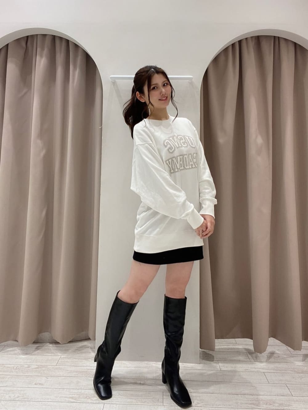 【ミニ丈×ロングブーツ】 少し暖かくなってきた頃におすすめのコーデ オーバーシルエットのパーカー×ミニスカートで、彼氏服風の組み合わせに 女性らしくロングスカートと合わせるのもおすすめですが、普段とのギャップでたまにはカジュアルテイストもいかがですか♡? チクチクした肌触りではないので、パーカーの肌触りが苦手な方でも挑戦しやすいですよ