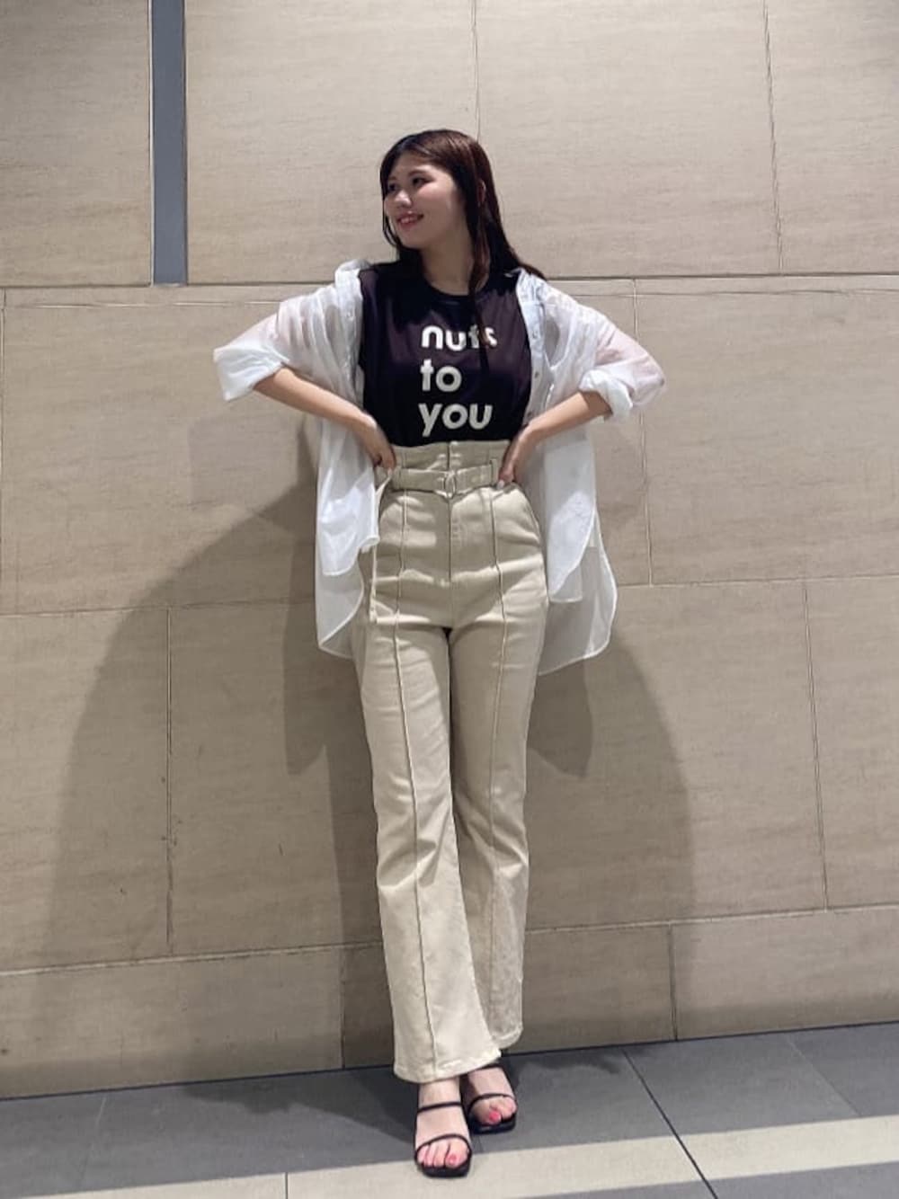 サーティワンコラボのカジュアルスタイル♡【シャツ】軽くて透け感のあるシャツ。1枚あれば気温差やノースリーブの時に便利です。外で見ると光沢があるのできれいめテイストにも◎なにかと便利な1枚です。【トップス】サーティワンアイスクリームコラボ商品♡よく見るとフレイバー名も書かれており、お洒落な字体がポイント。ノースリーブでもインナーが見えにくく、鎖骨が見える程度の開き具合なのでカジュアルになりすぎずに着れます。【パンツ】脚長おばけになれる美脚パンツ。ベージュカラーでもインナーが透けることなく問題なく着れます。またストレッチが効いているので歩きやすさ抜群。ブラウスなど合わせてフェミニンにも使えます。【サンダル】つま先のクッション性抜群のサンダル。足の甲部分がシアーになっているので、ブラウンでも重くなりすぎないです。変形ヒールですがクッション性があるため歩きやすく疲れにくいです☺︎横幅が広めに作られているのでサイズ大きめの方でも安心して履けます♡