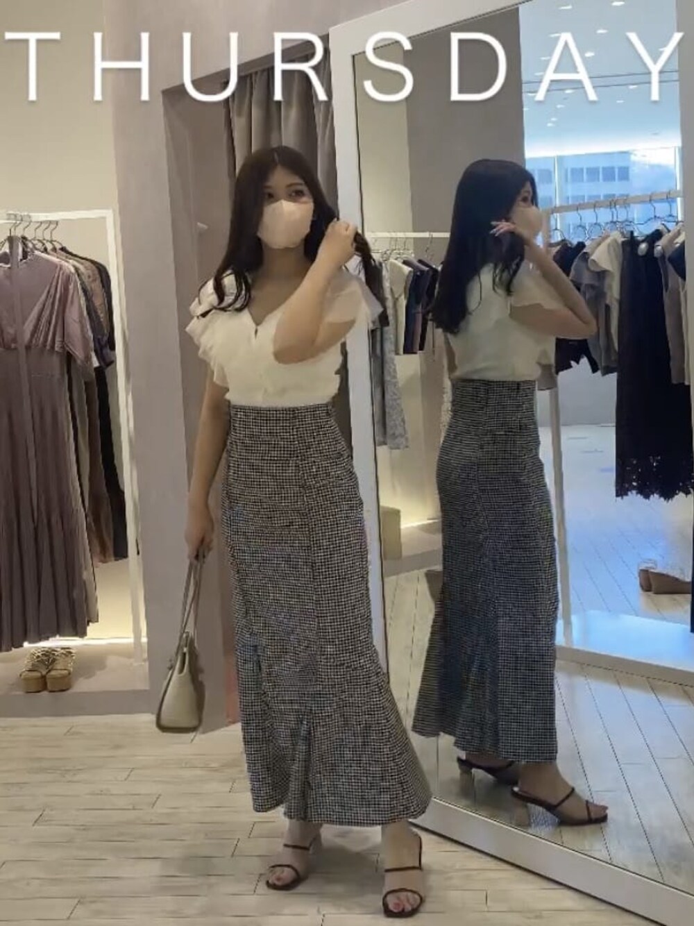 大人かわいいチェックコーデ♡ 【トップス】トップス、カーディガンの2wayで使えるニット。毎年の定番ですが、二の腕もスッキリ見え、シンプルで使いやすいので重宝します。インナーは少し透けるので、レースベアトップ等がおすすめ。【スカート】大人気すぎて店舗からも在庫が消えていたスカート。ギンガムチェックが程よい大きさなので可愛すぎず、大人な雰囲気♡チェック柄のマーメイドスカートは珍しいですが、カラー物と合うので着回ししやすいですよ☺︎【サンダル】つま先のクッションが柔らかいサンダル。変形ヒールですが長時間歩いても疲れにくく、お出かけにぴったり。横幅は少し広めなので、25cmの靴を履かれる方でも、店舗で履いてくださってます。【バッグ】マチがしっかりしてるのでペットボトルも入ります。取手部分を一括りし短く持つのもお洒落見え♡