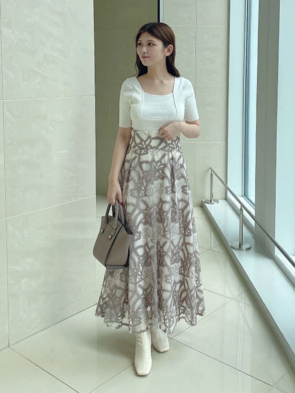 周りと差がつくオフィスモテ♡【ニット】前後2wayで着回しのできるニット。ホワイトは少し透け感があるためインナー必須です。リブニットですがピッタリした感じはなく、生地も柔らかいので体のラインに沿って着れます【スカート】チュール×刺繍の高見えスカート。ウエストゴムなので伸縮性もあり♡パッと目を引くデザインですが、派手すぎずコーデのアクセントに使えます【ブーツ】定番のストレッチブーツ。ヒールが太いので安定感のある歩きやすさです。【バッグ】ペットボトル、お財布、ポーチなど、、見た目以上に容量抜群✨!!お仕事にもプライベートにも使える優秀さもあり、これぞ高見えバッグ♡