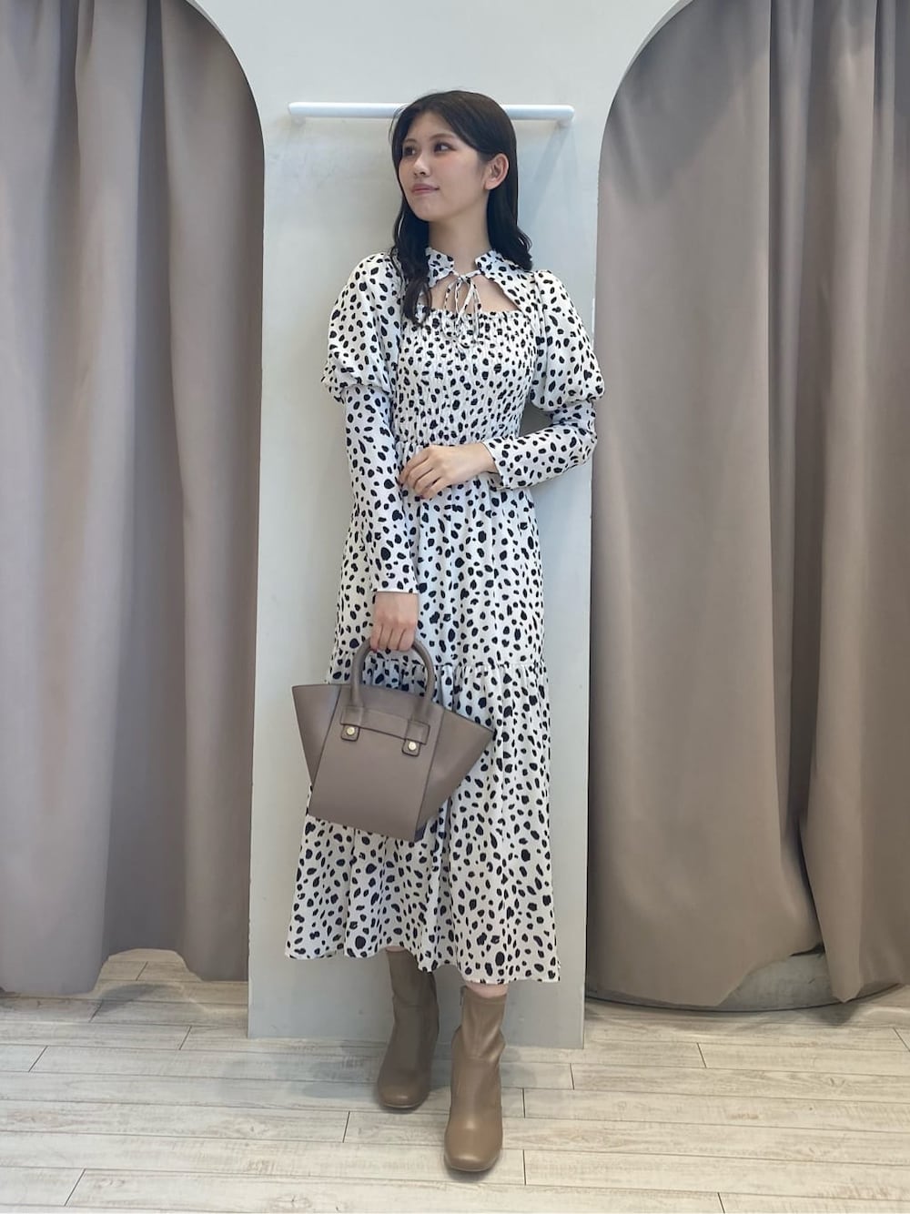 トレンドかつお洒落度120%ワンピース♡【ワンピース】前後2wayで使えるので、背中開きでも◎上半身のシャーリングは伸縮性もあり、締め付けなく着れます。162cm,Sサイズは7cmヒールでふくらはぎ辺り。ぺたんこ靴でも、丈感は短すぎません。透け感も気にならないので、安心して着れます。【ブーツ】ストレッチが効いているので歩きやすさ◎合皮ですので、最初横幅が少しきつくても馴染んでいきます。軽くて動きやすいのでおでかけにもおすすめ【バッグ】シンプルで高見えするバッグ。500mlのペットボトルやお財布、メイクポーチなどを入れてもスペースありました♡テイスト問わずに使えるのでデイリー使いにもおすすめです。