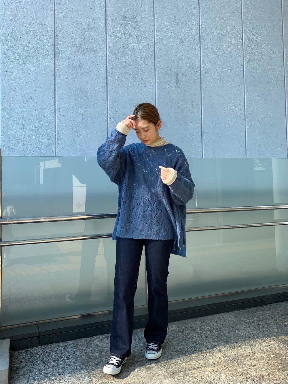 【カジュアルになりすぎない!knit×denimコーデ♡】デニムコーデはカジュアルのイメージが強いですよね!カジュアルになり過ぎないように、少し女性らしさをプラスしたコーデにしてみました♡【knit】ゆるっとしたシルエットで、ヒップラインまで隠れる長さです!ゆったりめですが、サイドスリットがあるので、すっきりした印象で抜け感があります♡透かし編みなので、風を通すかも?と思われがちのニットですが、とっても暖かいです!秋はインナーにキャミソールやタンクトップ、冬にはロンTeeやハイネックニットと合わせるのがおすすめです♡【Tee】1枚で着てもインナーで着てもかわいいロンTee!袖丈も長いので、インナーに着た時はちょこっとお袖から出すと可愛く着ていただけます!生地感も肌触りが気持ち良い1枚です◎【denim】大人気のストレートデニムで、脚にコンプレックスがある私でもたくさん履いている大好きなデニムです♡155cmの私はデニムの裾の長さを気にすることが多いですが、こちらのデニムは気にすることなく履けます♡是非試していただきたいデニムです!