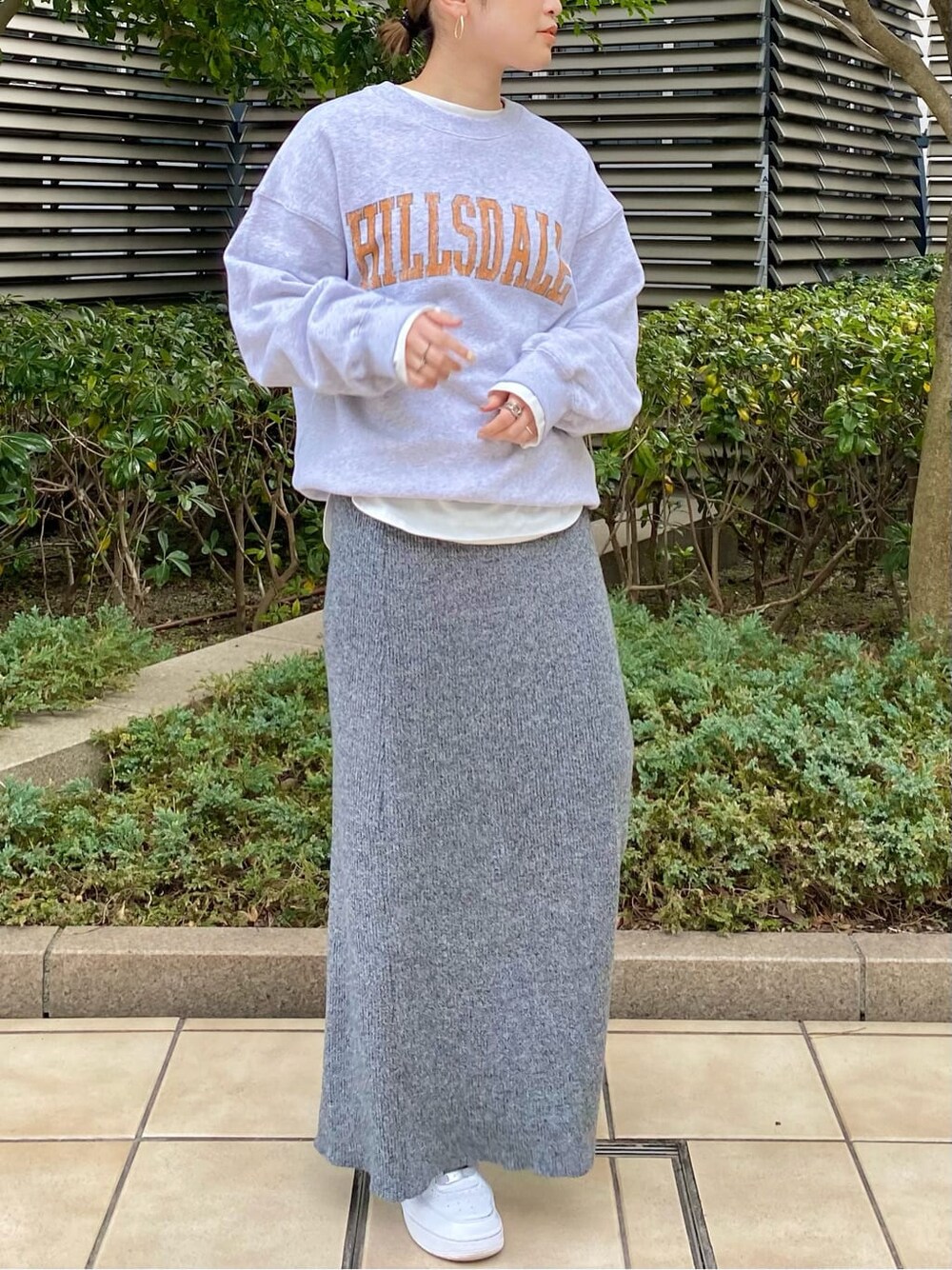 【カジュアルすぎないロゴスウェットコーデ♡】カジュアルに見えるロゴスウェットを、スカートと合わせて大人カジュアルな印象に仕上げました!【Tops】ルーズなシルエットが可愛くて、合わせやすい丈感のスウェット♡重宝間違いなしのアイテムです!生地感も柔らかく、厚すぎないので、合わせ方次第で春・秋・冬のシーズンで着ていただけます。冬はインナーにタートル合わせも可愛いです♪【Tee】私のコーディネートでもたくさん出てきているロンTee。1枚持っていれば着回し力抜群◎首元・裾口・手首からチラッと出すのがポイントです♡【Skirt】リブ編みで伸縮性が良くてオシャレなのに楽ちんなスカート!肌触りもよく、ストレスフリーな1枚です。気持ち良い質感の裏地も、膝上あたりまで着いているのでヒップラインも安心♡