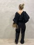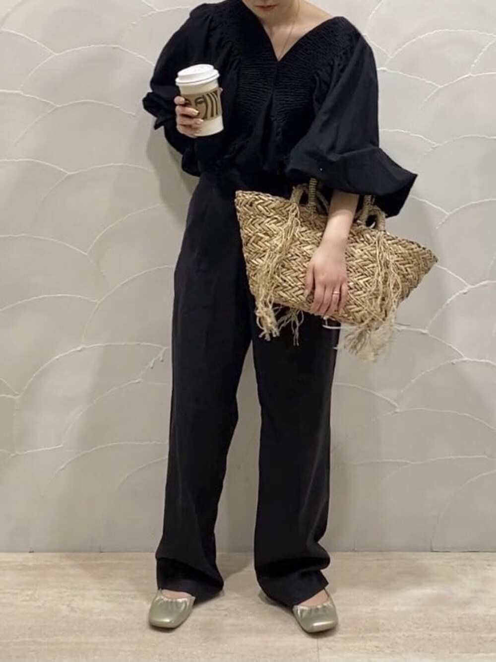 【キレイめコーデ♡】全体をブラックでまとめて、大人な印象に。【ブラウス】店舗でも人気なギャザーブラウス♡お袖のたぽっと感がたまらなく可愛く、全体的にルーズなサイジングですが、前後の首元が深めのVで開いているため、すっきりとバランスが取れます♡生地もしっかりとしているので、長い目で見ていただけます。何気ない日もこのブラウスを着ると、特別な日になる1枚です♡【パンツ】リネン混の為、さらっとしたお素材で、夏の暑がりさんにおすすめアイテムです♪丈が長く、155cmの私でSサイズだと、ヒールや厚底があると安心な長さです。シルエットが綺麗で、美脚見え間違いなしのパンツ♡【バッグ】ハンドバッグとしてもショルダーバッグとしても、どちらでもご利用いただけるバッグです!このバッグがあるだけで、夏らしさ+お洒落見えさせてくれます♡