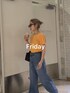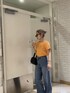 〈Friday/ビタミンカラーコーデ♡〉【Tシャツ】大人気のバックオープンTee。こちらのオレンジはパキッとしすぎず、肌馴染みの良いカラーです。生地はTシャツのようなカットソー素材なので、着心地も良くノンストレスです◎この写真では、少し高さのあるキャミソールを着用しておりますが、お下着のラインも気にならないように計算されている為、インナーも気にせずご着用いただける方が多いです!個人的には、バックオープンタイプのカップ付きのキャミソールなどと合わせていただくのがおすすめです♡ 【デニム】ゆるゆる好きにはたまらないデニム♡オーガニックコットンで柔らかく、デニムなのにデニムじゃないような履き心地!例えるなら…パジャマを履いているような気分になるくらいです♡♡♡155cmの私だとフラットシューズでは引きずってしまいますが、5cm程のヒールや少しソールのあるシューズなら◎ここまでずるっと可愛いデニムは他で出逢えないです!