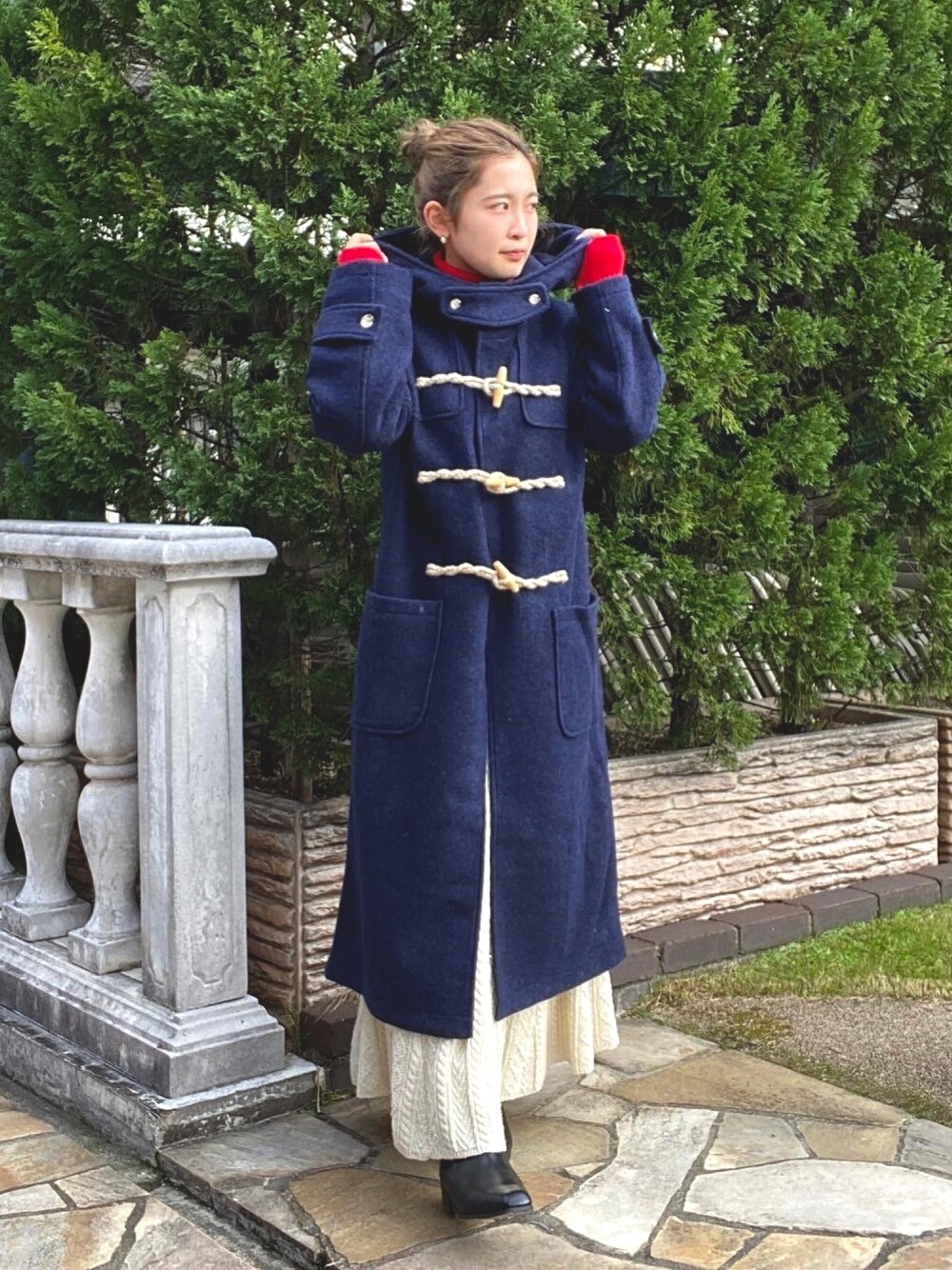 〈クリスマスコーデ🎄〉 【アウター】・人気のダッフルコートが、今年は軽いスライバーで登場♡・たっぷりとしかサイズ感で、今年らしいシルエット。・起毛感のある素材でカジュアルな雰囲気に! 【ニット】・洗えるニットでチクチクしにくく、肌触りが気持ち良い♡・フィット感はありながらも、体のラインがしっかりでるわけではないので、一枚でも着やすい。 【スカート】・細かなケーブル編みがかわいいニット♡・裏地付きで、透け感は気になりにくいです!・155cmの私でもフラットシューズで引きずらない長さ。