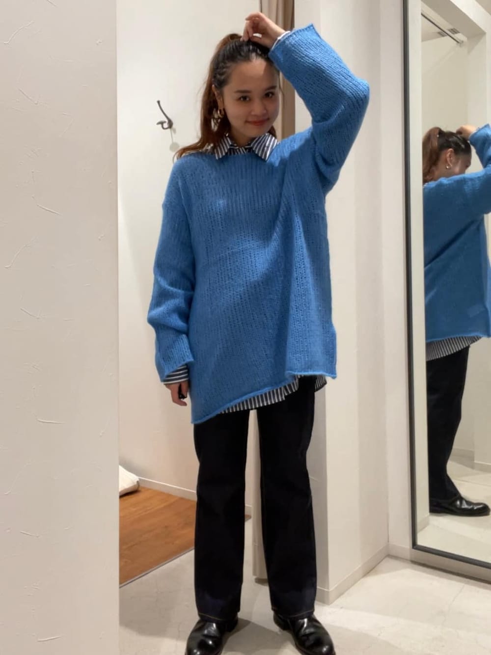 \透かし編みニット着回しリール動画のコーディネート/【ニット】156cmの私で膝上10cmくらいまでのルーズな丈感のニット。非常に軽く、とても楽ちんに着ていただけます!薄く軽いですがウール混なのでロンTなどとレイヤードをすれば温かみもあり、季節の変わり目からコートのインナーとしても幅広く使えそうです。カラー展開も豊富で今季らしいのでスタッフ人気率も非常に高く、人気間違いなしのニットです!【シャツ】セットアップでの着用も可能なストライプシャツ。ヒップもすっぽり隠れるルーズなサイズ感です。類似の#ストライプルーズシャツ よりも色味は落ち着いており、大人な印象で着ていただけます。 【デニム】ungridの定番人気なストレートの形で美脚写りするデニムです。156センチで24インチを履いていますが、丈はフラットシューズで問題なく履いていただけます。ハイウエスト設定×太すぎず細すぎずのストレート形になっているので足のラインは拾いたくないけど綺麗に見せたい方にとってもおすすめのデニムです。