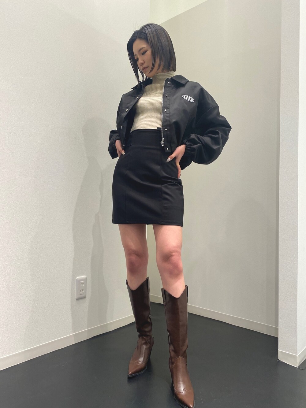 【アウター】EMODAで大人気のナイロンブルゾン!とても軽くて、サラッと羽織りやすいので春先にオススメのアウターです😊インナーを厚めのニットに変えれば、今からでも使っていただけます! 【ニット】毎年大人気のクラッシュリブニット🤍クラッシュのデザインが首元や袖に入っているので、シンプルすぎないのでコーデのポイントになります😊 【スカート】かなりハイウエストでほぼ胸下あたりまでウエストの長さがあるので足が盛れます🫶ストレッチがきいているので全く苦しくなく、インナーもついているため動きやすいです! 【ブーツ】今流行りのウエスタンブーツ! EMODAのブーツは派手な装飾がないので、どのコーデにも合いやすいデザインです。膝下のVカットが足を長くみせてくれます!