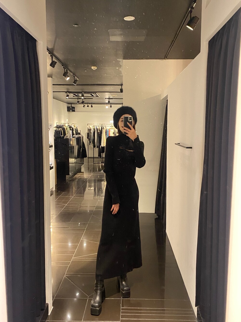 【ワンピ】形が綺麗すぎるワンピ👗ウエスト部分の切り替えが足をかなり長くみせてくれます!胸元のカット部分は空きすぎないので、肌見せしすぎず着ていただけます😊スリットは入っていないので合わせやすいです! 【ブーツ】ヒール12センチあるので足長効果あります!重さもあまり感じられないので、店頭で一日中履いてても足疲れしないです☺️