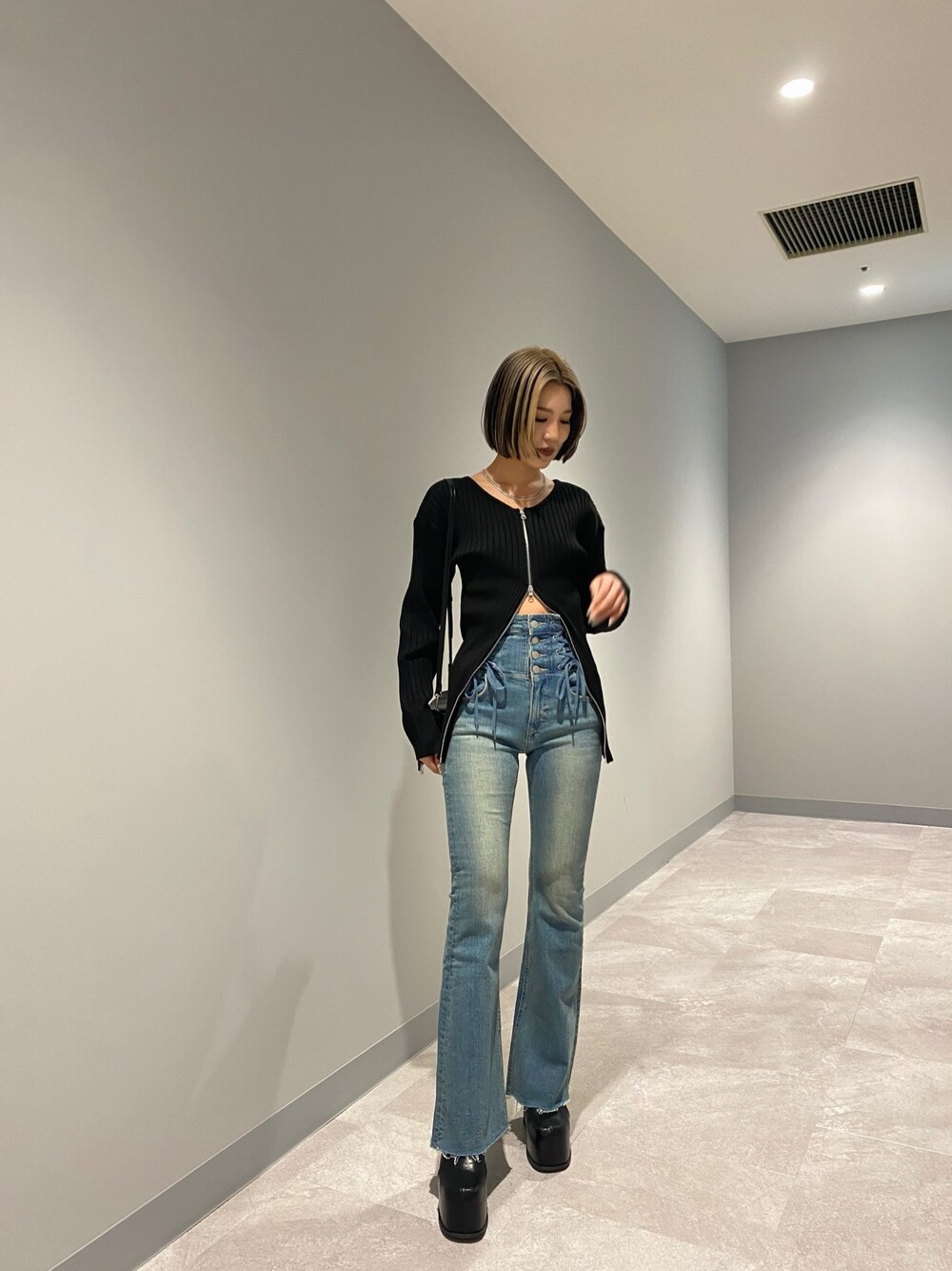 藤川陽(EMODA)のデニムパンツ「Wレースアップハイウエストフレアパギンス」を使ったコーディネート