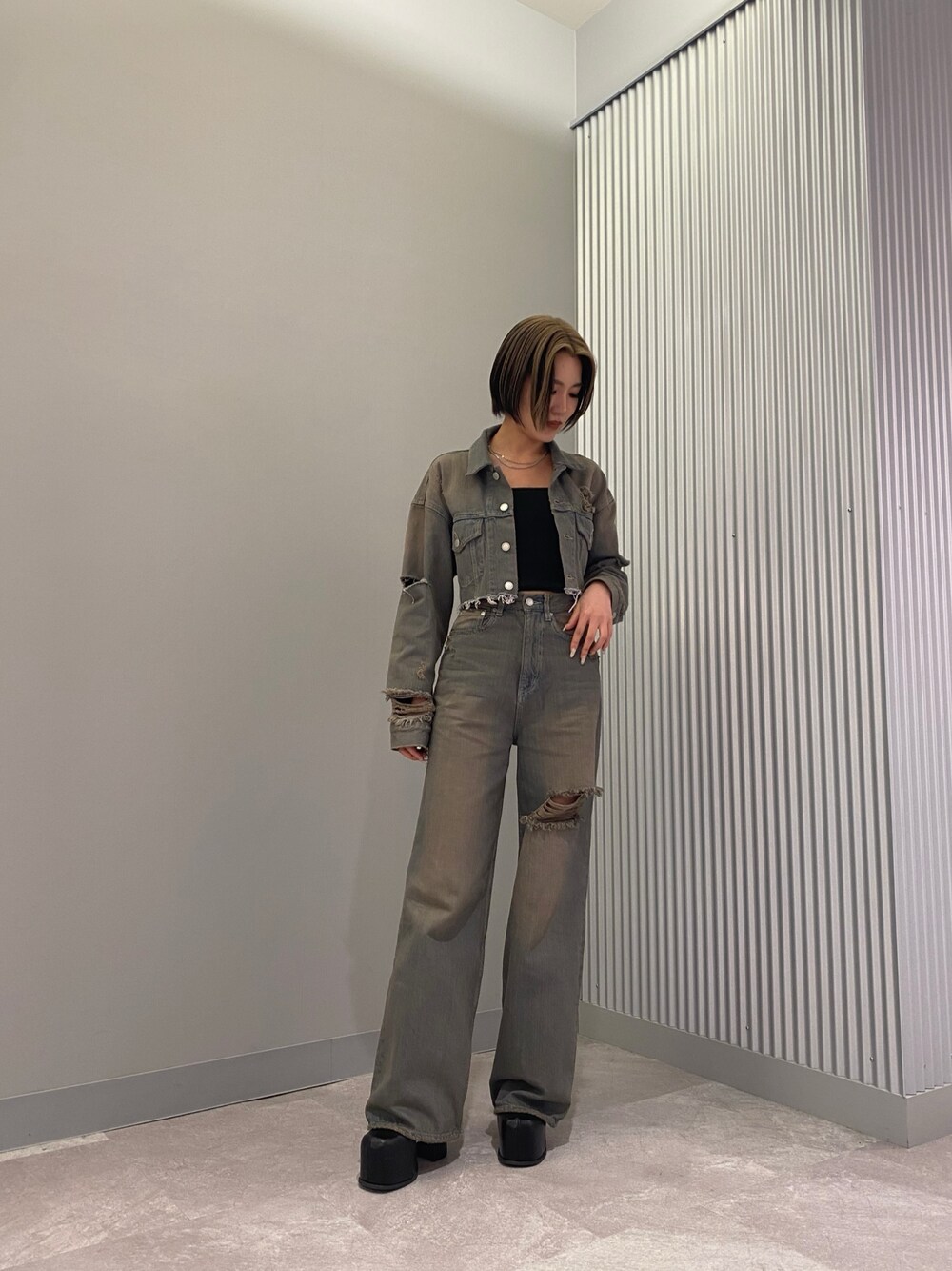 【ジャケット】丈が胸下くらいなので羽織るだけで足長効果あります😊クラッシュ加工も強めに入っているので、ありきたりなデニムジャケットではなくコーデのポイントになります! 【デニム】かなりハイウエストになっている為、足が長く見えるのと、骨盤周りがタイト目なのでシルエット綺麗にみせてくれます!お尻も上がって見えるデザインです!ヴィンテージ加工がかわいい🫶 【キャミ】パッド縫い付けられているのでズレる心配もなくピタッと着ていただけます!これからの時期にインナーとして使いやすいですよ! 【ブーツ】ヒール12.5センチありますが、つま先にも厚みあるので歩きやすいです!つま先まで覆われてるデザインなので足も長く見せてくれます!