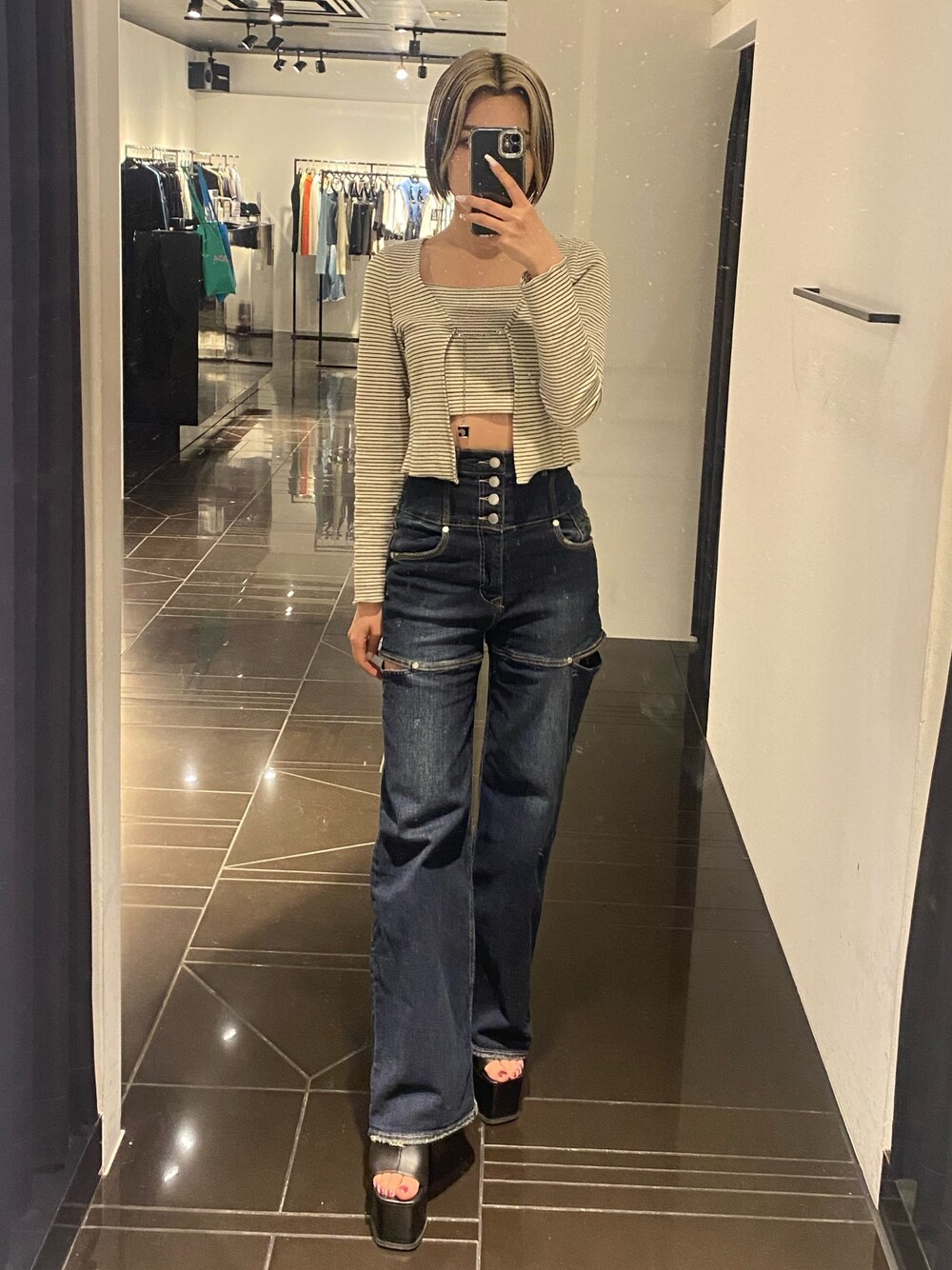 【トップス】チェーン取り外し可能のトップス!キャミが短めなので、ハイウエストのボトムと合わせるのがオススメです♡ピタッとしすぎないシルエットなので使いやすいですよ! 【デニム】両サイドにカット入ってるので、太ももかなり細く見えます!4つボタンのスーパーハイウエストデニムで足長効果もありつつ、柔らかめの生地なので履き心地とてもいいです! 【サンダル】ヒール14.5センチあるので、しっかり足長く見せてくれます♡安定感も抜群なので走れるくらい楽ちんです♪
