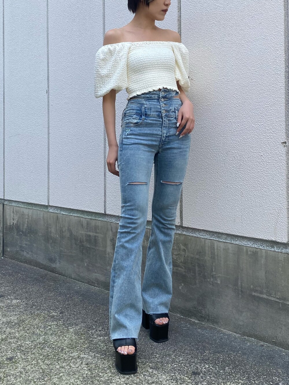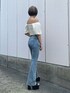 【トップス】2wayで着られるトップス!オフショルで着ると首周りすっきり見せられます!着方によって印象変えられるのでどのコーデにも合わせられます! 【デニム】ストレッチかなり効いてるので履きやすいです!カットが太ももの上の方に入っているため、膝下も長く見せてくれます! 【サンダル】ヒール14.5センチあるので足長効果あります!前にも厚みがあるので安定感もあり歩きやすいです!
