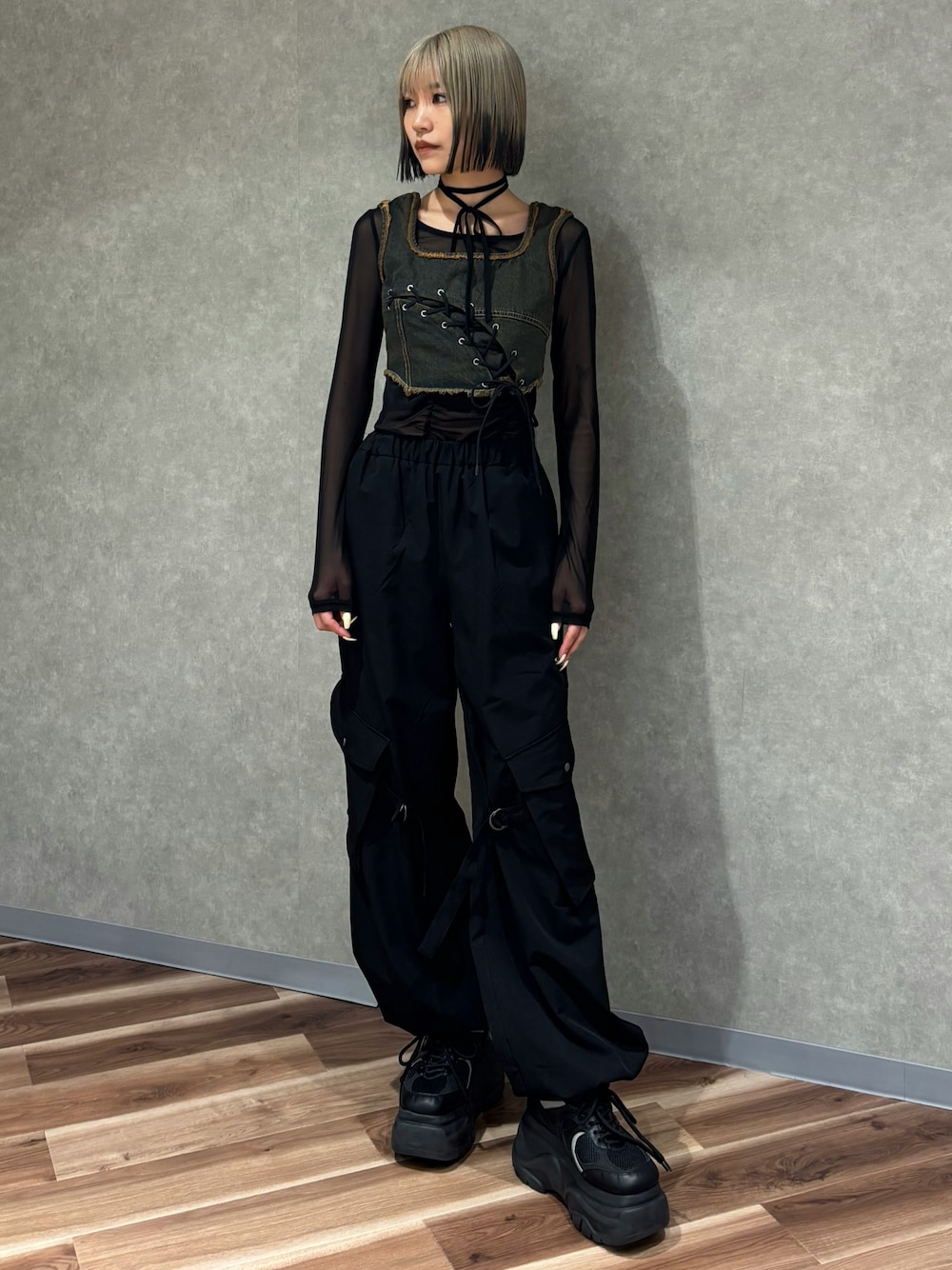 【トップス】 チョーカー付きのシアートップス♡チョーカーなしでも使えるので、どのコーデにも合わせやすいです!ギャザーが入っているので1枚でもかわいい☺️ 【ビスチェ】 カーブデザインのレースアップがポイント!後ろはゴムになっていて、伸びるので着用しやすいです! 【パンツ】 ベルト付きのナイロンパンツです!取り外し可能なので、2wayになってます!ウエストゴムなので楽ちんです! 【シューズ】 9.5センチあるのでしっかり足長効果があります!かなり重さ軽いので、足疲れしないスニーカーです✨ (足のサイズ23.5センチでMサイズ着用)