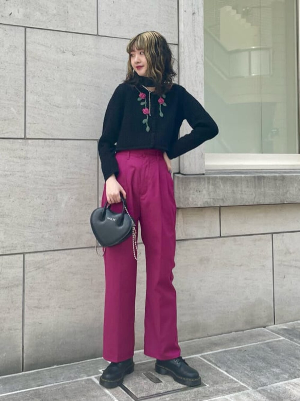 MILKコラボで大人ガーリーコーデ♥ 【カーディガン】ざっくりとした編みで着心地も抜群のカーディガン。jouetie定番のバラモチーフが立体的になっていてかわいい!ショート丈なので、ワンピースやハイウエストのボトムスと合わせても◎ 【ブラウス】BIGリボンがポイントのブラウス。リボンを後ろに結んで、チョーカーのように使うのがおすすめです!Vネックになっているので、大人っぽく着ていただけます! 【パンツ】今季トレンドのカラーパンツ。細すぎず太すぎないシルエットで履き心地も抜群です。カラーバリエーションが豊富なのもポイント!モノトーンコーデの差し色に使うのもおすすめです!