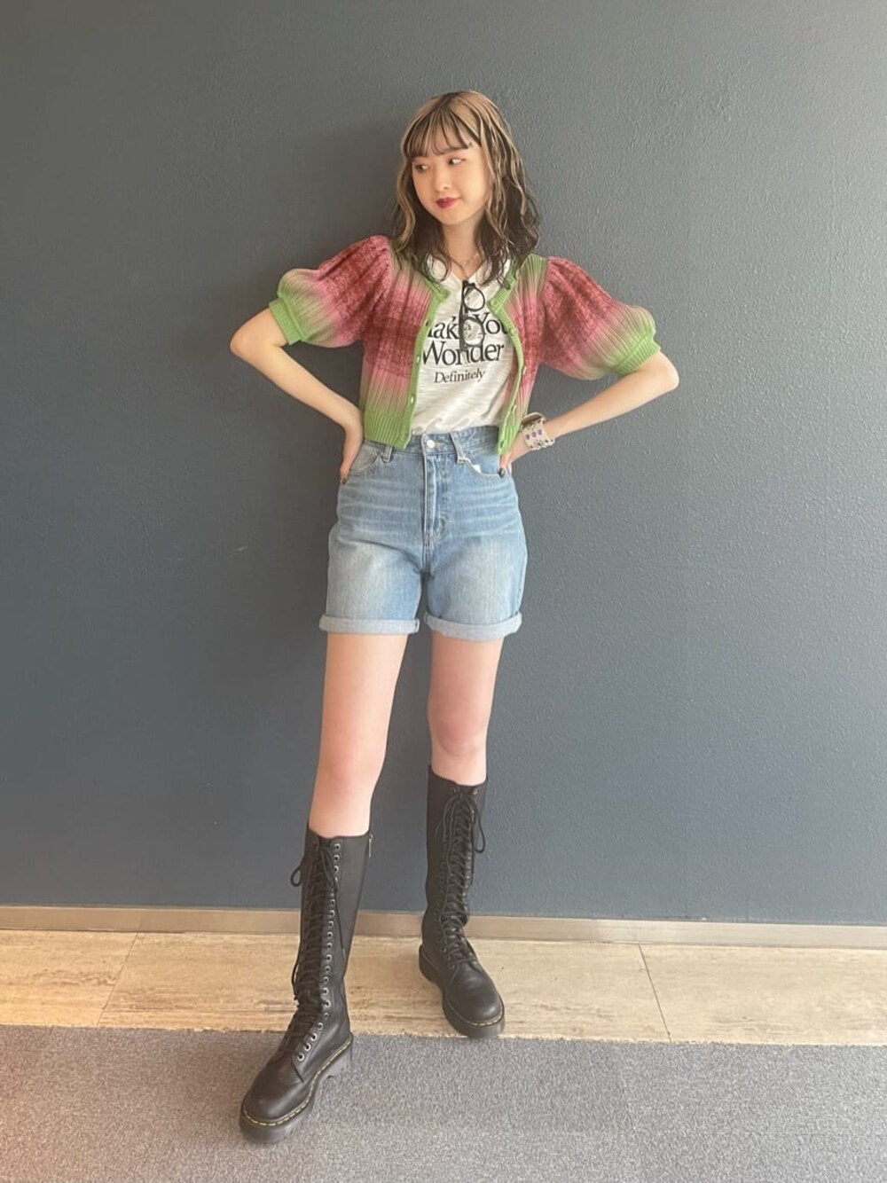 カラーアイテムでカジュアルコーデ♥ 【カーデ】オリジナル配色のグラデーションカーデ。jouetieならではのカラーが可愛いです!セットアップのスカートと合わせるのもオススメですが、今回はカーデだけ着てみました♥ショート丈なのでハイウエストのボトムスと合わせるとよりスタイルアップします! 【パンツ】バックのレースアップのデザインがポイントのショートパンツ。 裾をロールアップすることでレングス調整が可能なのもポイントです!デニム生地なのでどんなトップスとも相性抜群です♥