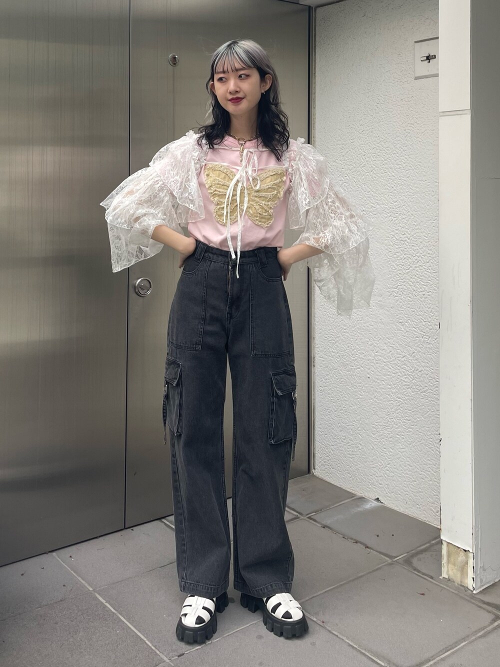 カジュアルガーリーコーデ💓 【Tシャツ】バタフライモチーフがドッキングされたTシャツ。jouetieならではのキャッチーなカラーが可愛いアイテムです♥いつものボトムスに合わせるだけでトレンドコーデになります! 【ブラウス】ティアードデザインでボリュームのある付け袖。レース生地なのでレイヤードスタイルにぴったりです!いつものコーデにプラスするだけでオシャレ見えするアイテムです♥ 【パンツ】カーゴディテールのデニム。ルーズなサイズ感で168cmでも短すぎない丈感で履けます!デニム生地なのでオールシーズン使えるアイテムです!甘めのコーデにも可愛いです!