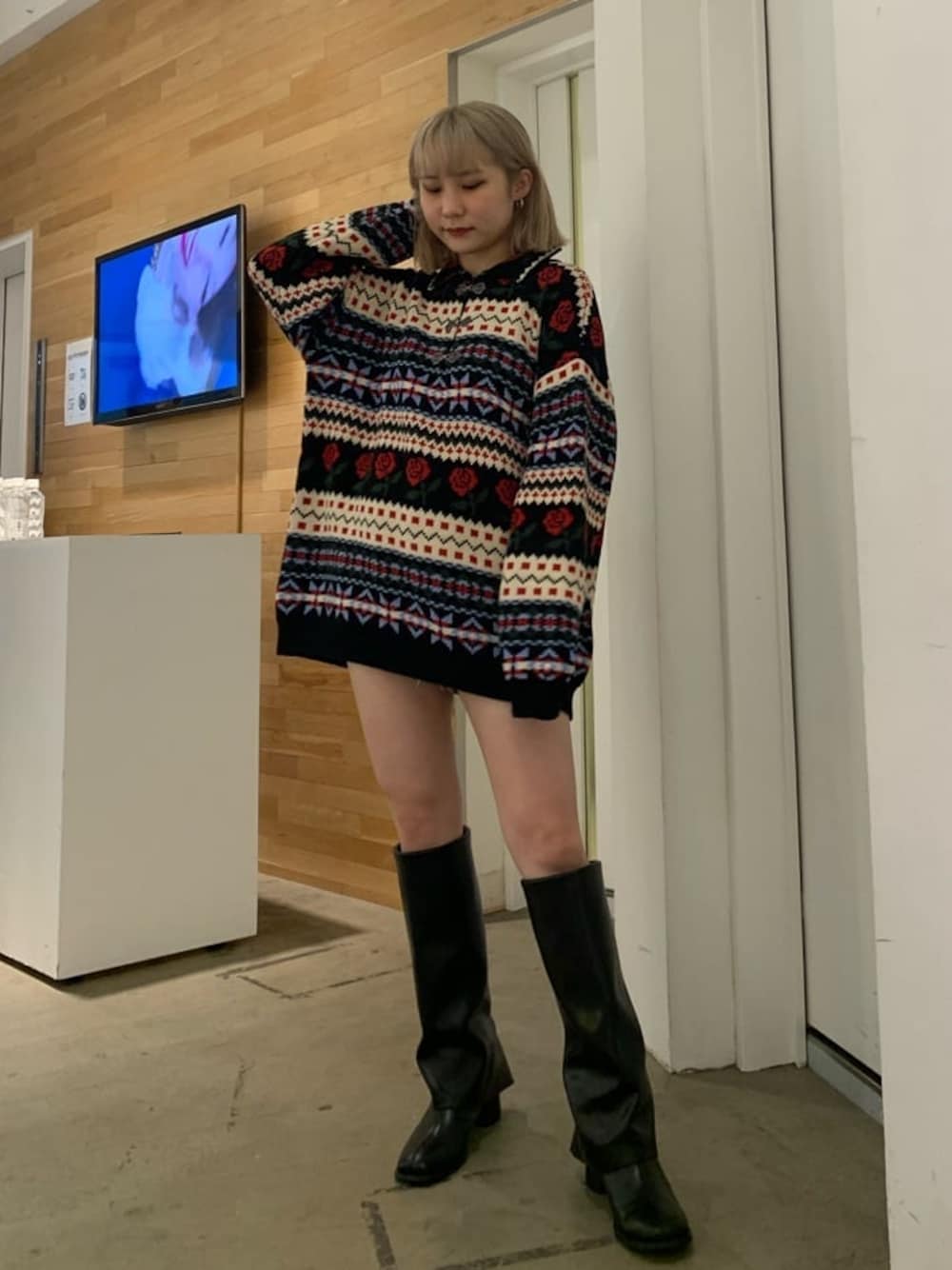オリジナルのジャカード柄でローズモチーフがjouetieらしいニット♡オーバーサイズで158センチでお尻しっかり隠れる丈感です!カバーロングブーツを合わせて一枚でゆるっと着用してます!!ヴィンテージライクなフックボタンがポイント◎1枚で充分暖かいので秋冬にもってこいなアイテムです!