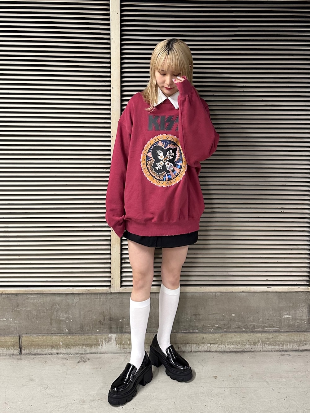 【プルオーバー】KISSとのコラボアイテムのぷるおーはダメージ加工が施されておりjouetie らしい1枚です!お尻すっぽり隠れるゆったりとしたサイズ感でチュニック風に着れる丈感となってます!【ワンピース】配色の襟がポイントのワンピース♡ガーリーなワンピもレイヤードで甘過ぎずカジュアルな印象に♪【ローファー】重めのチャンキーソールがアクセントのローファーは安定感があり履きやすさ◎とても軽く美脚効果も期待できるアイテムです!