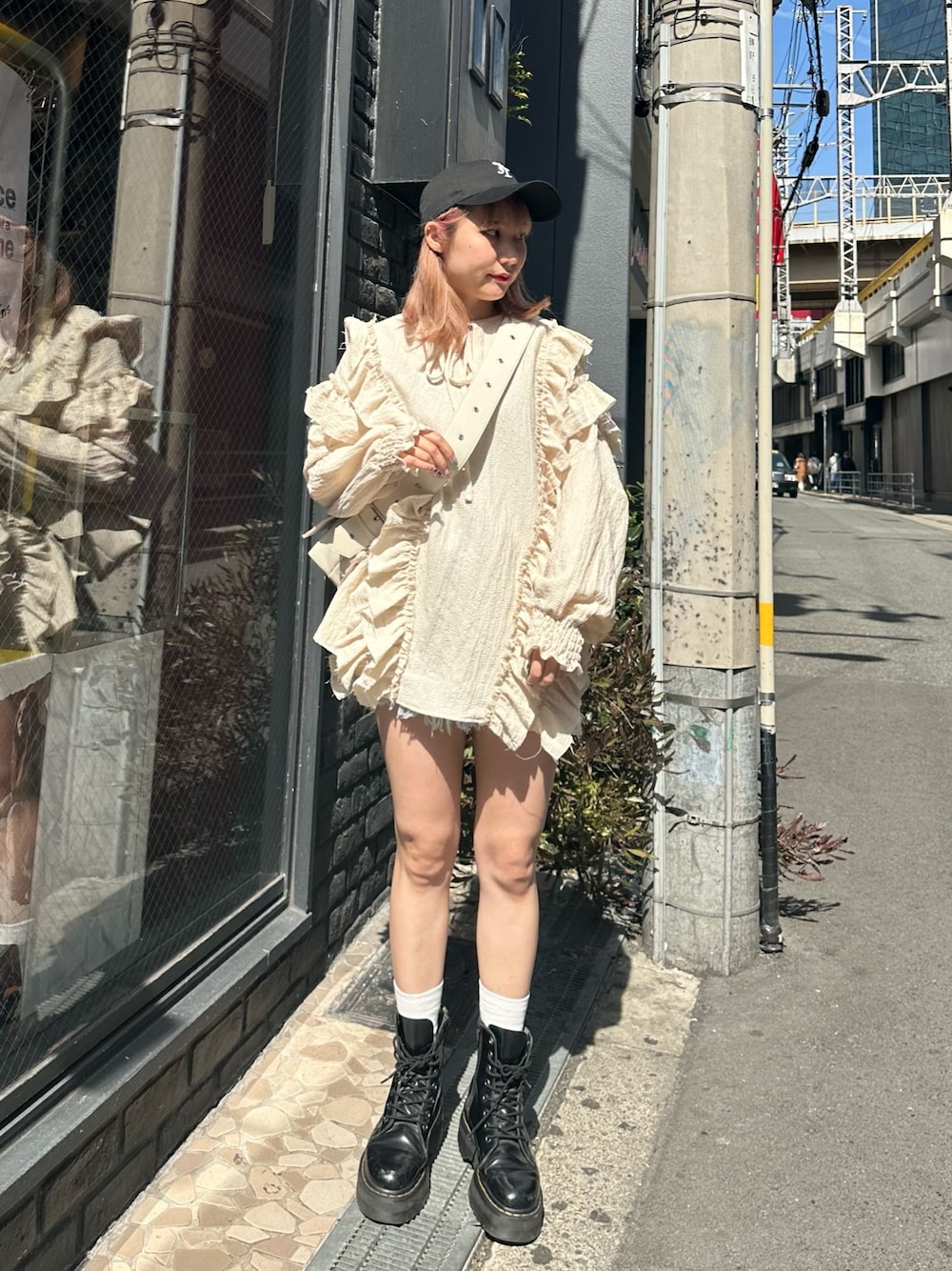 スポーティー×ガーリーMIXコーデ♡ 前後2WAYで使えるフリルブラウスは柔らかい生地感でヴィンテージライクなデザインになってます。オーバーサイズで158cmでお尻すっぽり隠れます!キャップとショルダーバッグでガーリー過ぎずバランスよく着用できます◎