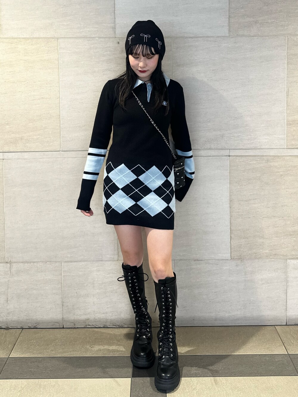 【ワンピース】フィット感のあるタイトなシルエットが体のラインを綺麗に見せてくれるワンピース♡ポロデザインや、アーガイルチェックでカジュアルダウンしてコーディネート組んでいただけます🎶 【ブーツ】jouetie定番厚底レースアップブーツ♡ストレッチが効いた素材で柔らかく履き心地抜群です!ミニボトムスと合わせるとコーディネートが締まり、すっきり見えるマストバイアイテムです!🎶24cmでLサイズ着用。 【帽子】メタルボールのリボンモチーフがトレンド感&コーデのポイントになるビーニー🎀メンズライクになり過ぎずに着用できます! 【バッグ】ハート刺繍がガーリーさを際立たせるバニティバッグ💖コンパクトなサイズ感ながら大容量なのがポイント!必需品しっかり収まるサイズです♡ 【ネックレス】ハートがワンポイントになったチョーカー❤︎大きすぎないデザインなのでチラッと見せたい時におすすめです!