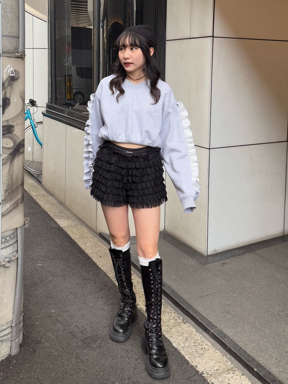 【トップス】胸元のラインストーンロゴと袖のフリルデザインがポイントになったプルオーバー🍒ゆったりとしたシルエットですが、クロップド丈でスッキリ見せが叶うアイテムです🤍 【パンツ】取り入れるとトレンド感UPするレースパンツ🖤チラッと見せがコーデのアクセントになります!ボリューム感はそこまでないのでインナー使いも◎ 【ブーツ】jouetie定番厚底レースアップブーツ♡ストレッチが効いた素材で柔らかく履き心地抜群です!ミニボトムスと合わせるとコーディネートが締まり、すっきり見えるマストバイアイテムです!🎶24cmでLサイズ着用。 【ヘアバンダナ】トレンドのバブーシュカがjouetieからも登場💞可愛くヘアアレンジして付けていただくのがオススメです!コーデが物足りないときに+1で付けるとアクセントになります!🌼