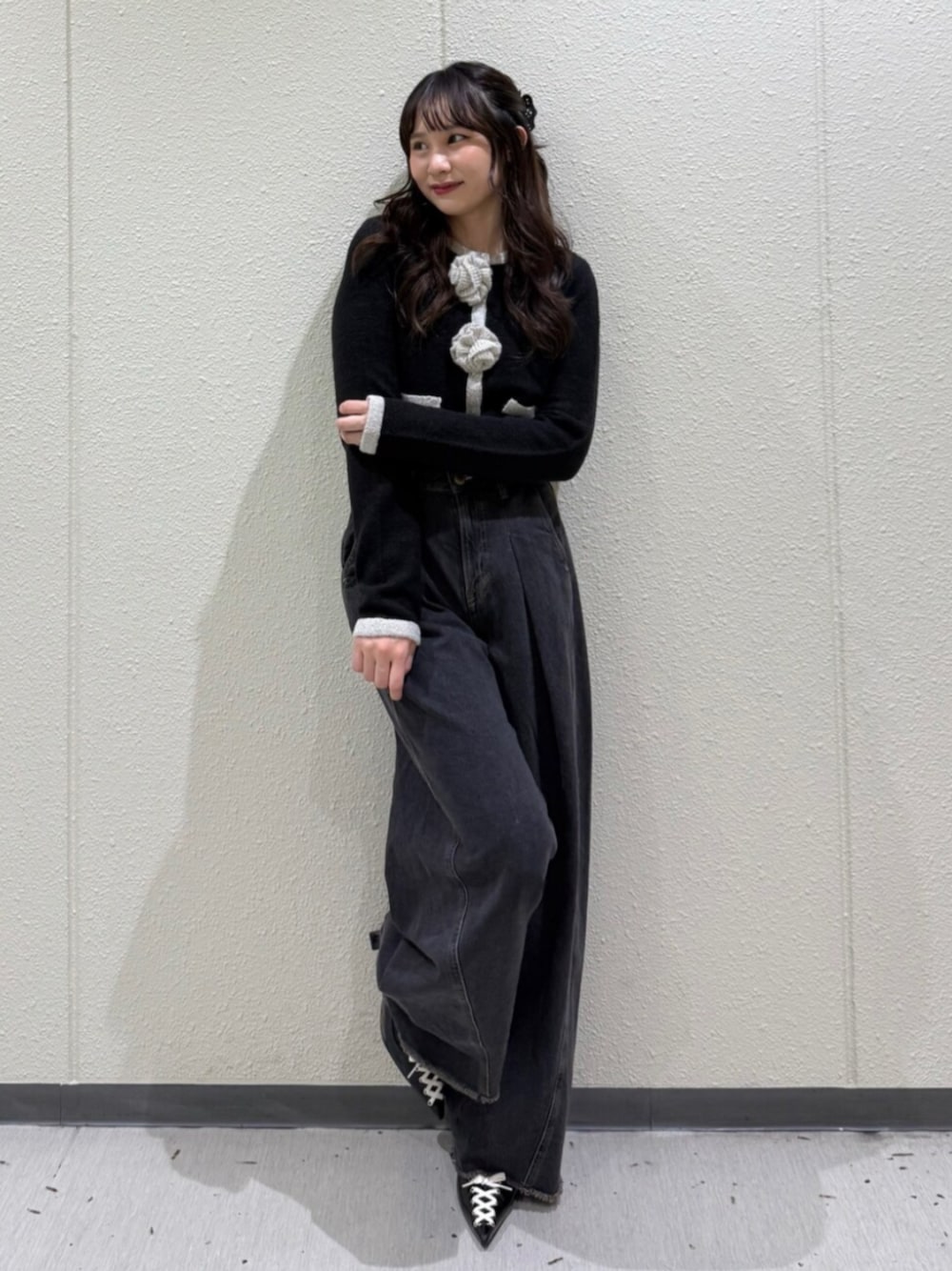 【トップス】コサージュが目を惹くカーディガン🌹取り外し可能なのでお好みの位置に変えたり、別のアイテムと合わせて使っていただけます♬コンパクトなサイズ感ですが、ピタピタ過ぎず着用できます! 【パンツ】少し丸みがかったラウンドシルエットのデニムパンツ♡158cmでSサイズで丈感ジャストで着用できました!ダボっとシルエットがお好みの方はMでズルズルっと着用しても可愛いです🎶 【シューズ】スニーカーライクなレースアップデザインを落とし込んだパンプス♥ カジュアルにも綺麗めにもハマりやすく、他にはないjoietieならではよデザインです♪。普段24cm着用でLサイズがピッタリでした!ストラップ付きで脱げる心配なしです♪。