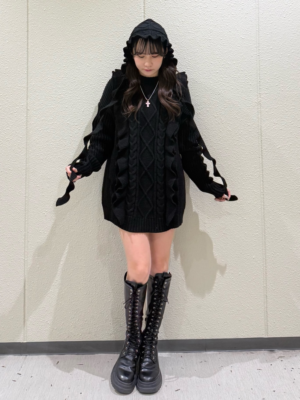 【ニット】SNSでもバズり中ニット♡チュニック丈なのでワンピぽく1枚で着るのがおすすめです◎158cmでミニボトム入れて見えずに着用できる丈感となっております!厚手のニットでフリルのボリューム感も◎ 同色で発売しているバラクラバと合わせるのがオススメです🎀冬の主役コーデ間違いなし✨ 【ブーツ】 jouetie 定番厚底レースアップブーツ♥ストレッチが効いた素材で柔らかく履き心地抜群です!ミニボトムスと合わせるとコーディネートが締まり、すっきり見えるマストバイアイテムです!♪♪24cmでLサイズ着用してます!