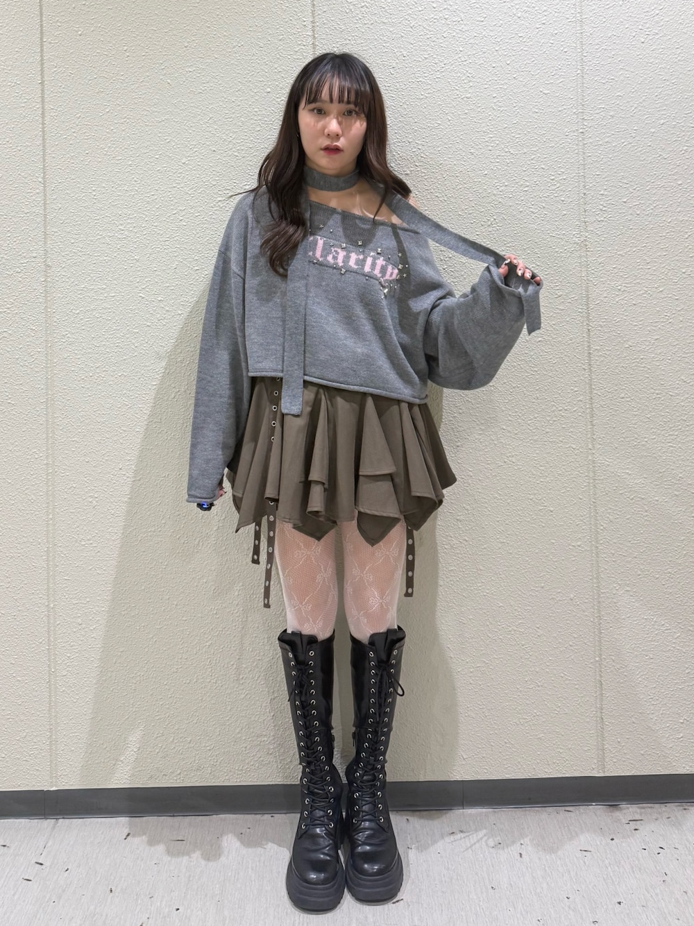 【ニット】フロントのスタッズとバックの羽デザインが可愛いニット♡🪽太めのチョーカー付きでさりげなく肌見せできるアイテムです⭐︎ショート丈ですが、身幅広めのニットでゆったりと着用できます✨ 【スカート】ベルトデザインがポイントのスカート ♥インパンになってるのでミ 二丈でも安心して着用できます※イレギュラーなシルエットで骨盤あたりのラインもカバーしてくれます 【ブーツ】 jouetie 定番厚底レースアップブーツ♥ストレッチが効いた素材で柔らかく履き心地抜群です!ミニボトムスと合わせるとコーディネートが締まり、すっきり見えるマストバイアイテムです!♪♪24cmでLサイズ着用。