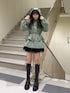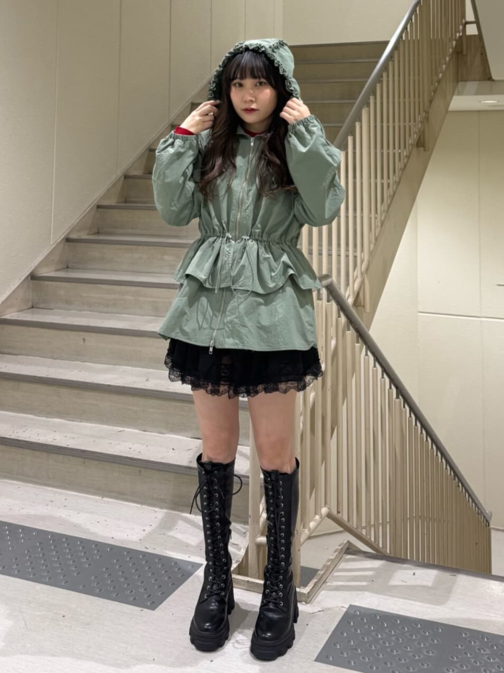 【ブルゾン】フリルたっぷりのマウンテンブルゾン♡ドローコードでウエストが絞れるようになっているのでスタイルアップも✨158cmでヒップかかるくらいの丈感です!★ 【スカート】ボリューム感たっぷりなレーススカート♥インパン付きなので安心して着用していただけます!ボリュームが大きく出るので、オーバーサイズのトップスとの合わせがシルエット綺麗に決まります! 【ブーツ】Jouetle 定番低レースアップブーツ♥ストレッチが効いた素材で柔らか <履き心地抜群です!ミニボトムスと合わせるとコーディネートが締まり、すっきり見えるマストバイアイテムです!♪♪24cmでLサイズ着用しております。