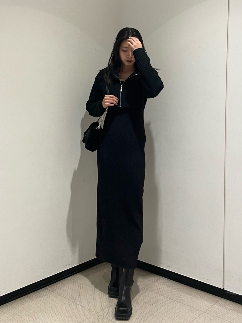 着回し抜群ロングワンピを使ったオールブラックコーデ🖤 ~ワンピース~ ジップのトップスとセットで2ピースになっています!! 中も長袖になっているので1枚でも使って頂けます!ジップのトップスはボトムスにデニムやスカートを合わせて別のコーデでも使えるので着回し抜群です🫶🏻💭 フリーサイズですがしっかり丈があるので高身長さんにもオススメです❤️🔥 ~ブーツ~ 私のリアルバイおすすめブーツ✨ 25.5cmでLサイズ着用してます! 大人気サイドゴアブーツですが、デザインが他と被らないのが可愛い‼️❤️🔥 ヒール高すぎないので安定感もあり、歩きやすいです! ~バッグ~ 秋冬用にワンポイントで可愛いモフモフバッグ🫶🏻ショルダーとハンドバッグで2wayで使えます!しっかりマチがあるので小さめのバッグですが収納も抜群です✨️