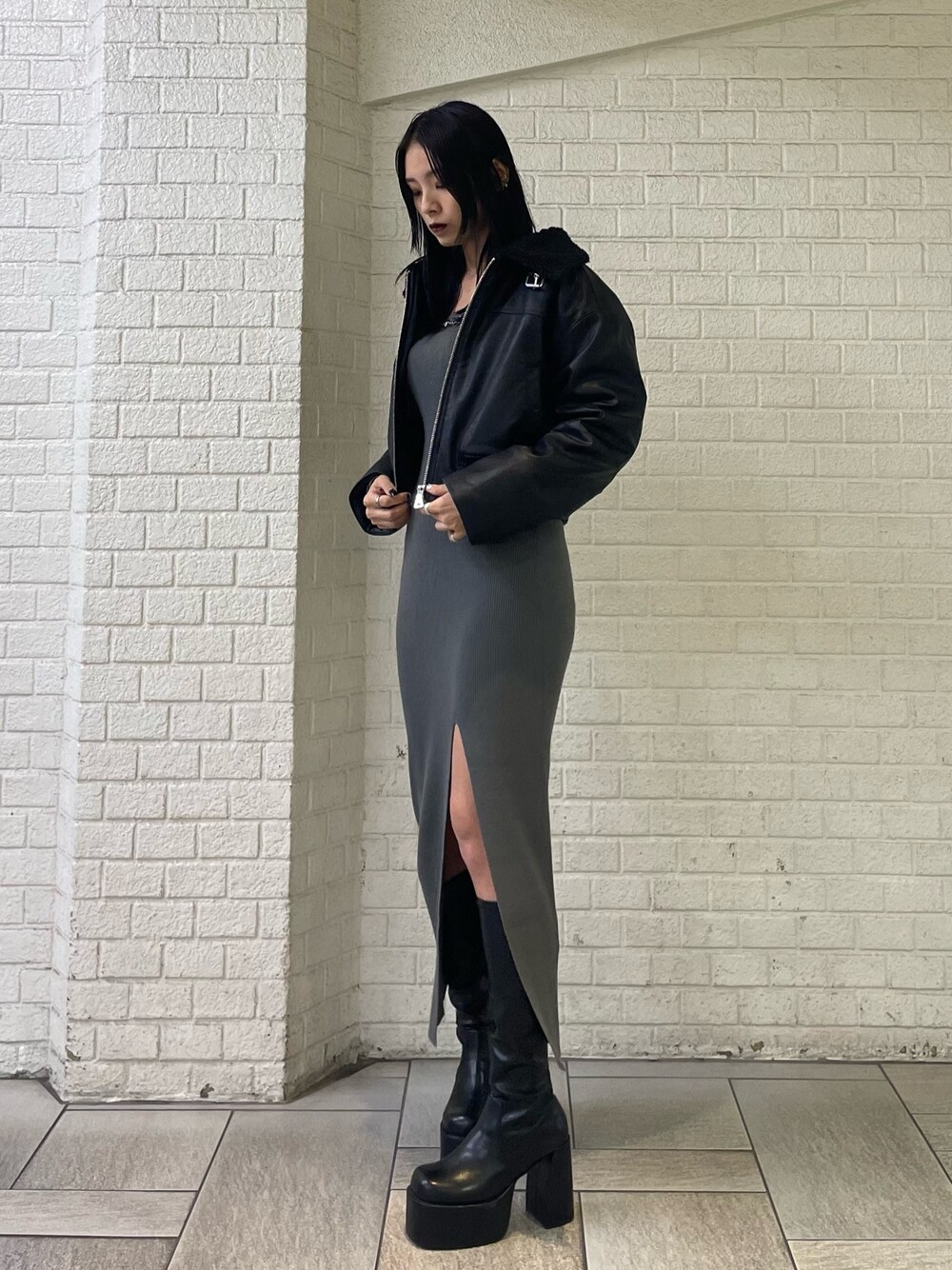 店頭で大人気の細見えロングワンピ🖤🤍 ~ワンピース~ 身長168cmの私でもしっかり丈があるので高身長さんにもオススメワンピ✨️ チェーンは取り外し可能なのでお洗濯にも困りません😎 ウエストの切り返し部分が高めになっているのとリブになっているため、着るだけでクビレが出来る魔法のワンピースです🫶 前スリットなのが肌見せで抜け感を作ってくれて、脚細見え効果も抜群です👍 〜 ブルゾン〜 中がボアになっていないので今からでも着られる+袖口が広めに作られてるので分厚いニットなども中に着込めるので冬まで使える万能アウターです❤️🔥 とっても軽いのが特徴で、ショート丈なのでスタイルアップ効果も抜群✨️ デザインがEMODAらしくて他と被らないのが可愛い🫶🏻 ~ブーツ~ 大人気の膝下-5キロブーツ‼️ 25.5cmでLサイズ着用しております! 伸編性があり履きやすく、ピタッとフィットしてくれて、ずり落ちてくる心配もないので脚を綺麗に盛ってくれます✨️ 傾斜が少なく、安定感もあるので歩きやすいのもポイントです🫶🏻💭