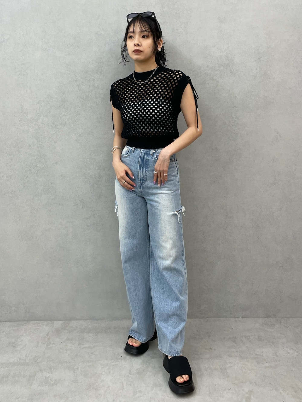 キレイめカジュアルコーデ🫶🏻 ~トップス〜 Web限定の大人気アイテム❤️🔥 クロシェになっていてさり気ない肌見せが上品な印象に✨️ ノースリーブですが、しっかり長さがあるので二の腕気になる方も挑戦しやすい🥺 肩にリボンが付いてるのがポイントになり可愛いのもオススメ🫶🏻 ~デニム〜 去年も大人気だったカットワイドデニム✨️ 168cmでSサイズ着用 太すぎないストレートめなシルエットと高めの位置に入ったカットが美脚効果抜群❤️🔥 ~サンダル〜 25.5cmでLサイズ着用 去年に引き続き大人気サンダル🤩 とにかく軽くて歩きやすい‼️ 脱き履きが楽チン‼️ どんなコーデにも合わせやすい‼️ 普段あまり厚底履かない方にもオススメのサンダルです❤️🔥