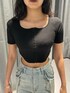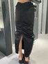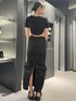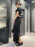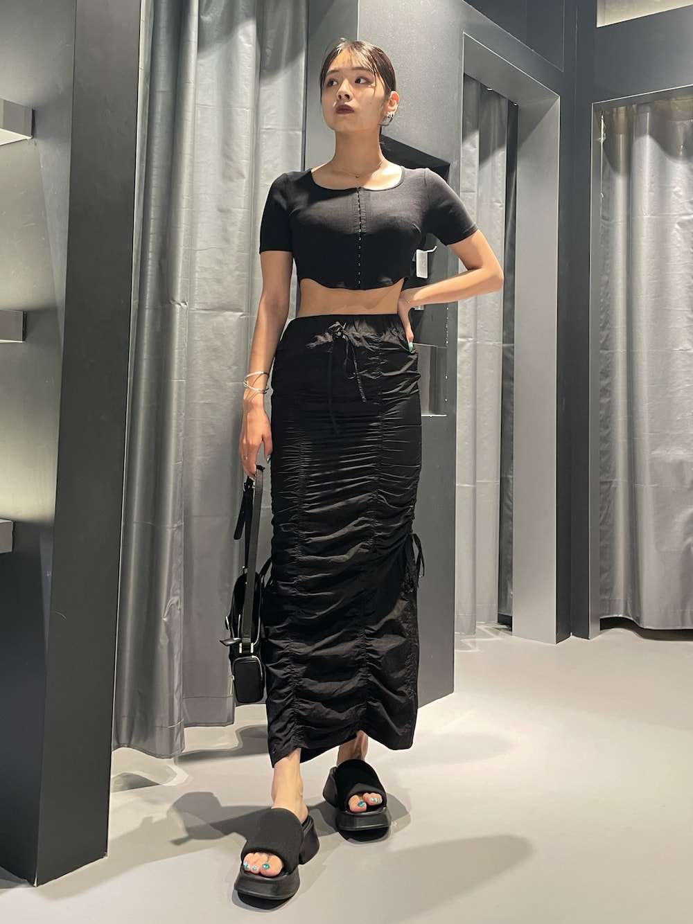 モードカジュアルコーデ🖤 ~トップス~ 今期トレンドのホックデザイン🫶🏻 ウエストがVカットのデザインになっていて超細見え✨️ スクエアネックになっていてデコルテも綺麗に見えて小顔効果⭕️ めちゃくちゃ着痩せするオススメトップスです🏆 ~スカート~ 身長168cmでもこの丈感で着られるため、高身長さんにもオススメ✨️ クシュクシュとしたドロストのデザインが脚を着痩せして見せてくれます❤️🔥 ナイロン素材なので涼しくて夏にもオススメ‼️ ~サンダル~ 25.5cmでLサイズ着用 去年に引き続き大人気サンダル❤️🔥 とにかく軽くて歩きやすい‼️ 脱き履きが楽チン‼️ どんなコーデにも合わせやすい‼️ 普段あまり厚底履かない方にもオススメのサンダルです✨️