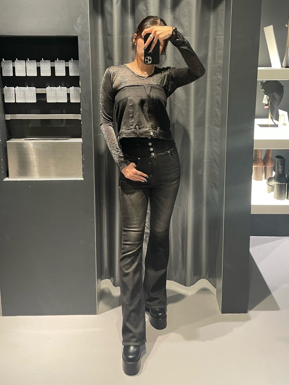 魔法の3wayデニム‼️✨️ オールブラックコーデ🖤 ~デニム〜 3wayデニムで着回し抜群😍 168cmでSサイズ着用してます 丈が長めなので高身長さんにもオススメ✨️ ①シンプルにフレアデニムとして着用 ②付属のデニムスカートをレイヤードするとスカパンに‼️ ③デニムスカートをトップスとしてベアトップ風に着用することも出来ます⭕️ 伸縮性も抜群で履きやすいのもポイント❤️🔥 このコーデでは③の着方をしていて、デニムセットアップコーデが完成します🤩 ~インナー~ リアルバイトップス‼️ 上品なラメと透けすぎないシースルーが高見えするオシャレアイテム❤️🔥 1枚でトップスとして着ても、インナーとして着ても使えるので着回し抜群✨️ ~ブーツ~ 25.5cmでLサイズ着用 毎年大人気のサイドゴアブーツ🏆 傾斜が少ないため安定感があり、歩きやすさ抜群❤️🔥 軽いので疲れにくいのもポイント✨️