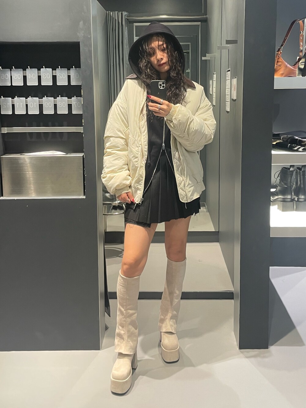 モノトーンコーデ🖤🤍 ~パーカー~ リアルバイアイテム😎✨️ オーバーサイズで、168cmでもヒップが隠れる丈感のため高身長さんにもオススメ‼️ ダブルジップになっているのが、トレンド感抜群でおしゃ見え😍 サラサラした生地で着やすく、毛玉になりにくい素材なのもオススメ❤️🔥 ~アウター~ トレンドのオーバーサイズの丈感✨️ 168cmでヒップ3分の2が隠れる程度の丈感で着られます😎 軽くてとても着やすいのと、袖口が広めに作られているため、中にたくさん着込めるのもオススメポイント❤️🔥 ~スカート~ 168cmでMサイズ着用 高身長さんは丈でMサイズがオススメ✨️ トレンドのプリーツスカート😍 細かいプリーツとハイウエストデザインがモードらしい印象を与えてくれるのと、ショート丈のトップス合わせでスタイルアップ効果抜群🤩 ~ブーツ~ 店頭&Webで大大大人気ブーツ🏆 25.5cmでLサイズ着用 フレアデザインが他になく、被らないのが可愛いポイント♥️ 伸縮性抜群なので履きやすい‼️ 傾斜が少ないので、安定感抜群で歩きやすい‼️ これを履くだけでコーデがおしゃ見えします😳❤️🔥