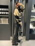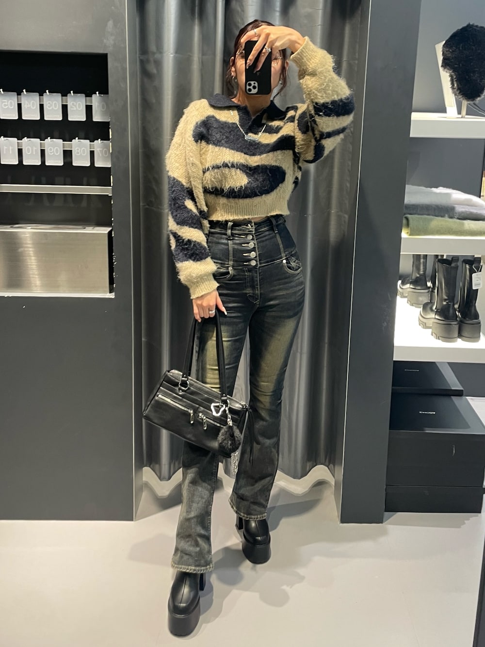 ~トップス〜 首元のチャームは取り外し可能 付けるとキレイめな印象になり、外すとカジュアルな印象になります EMODAオリジナル柄が他にはなく可愛いのと、ゆったりめのサイズ感ですが、ウエストはリブになっていて細見えします ~デニム〜 168cmでSサイズ着用 超脚長効果抜群デニム 伸縮性抜群で履きやすい 丈が長めなので高身長さんにもオススメ フロント加工が脚を立体的に見せてくれて美脚効果も抜群 ~ブーツ〜 25.5cmでLサイズ着用 ベルトチャームは取り外し可能なので、色々な系統のお洋服に合わせることが出来ます 傾斜が少ないので安定感抜群で歩きやすい 見た目に反して軽いので、疲れにくくオススメ ~バッグ〜 チャームは取り外し可能 大容量なので使いやすい カラバリも豊富で全てベーシックカラーなので、どれも色んなコーデに合わせやすい