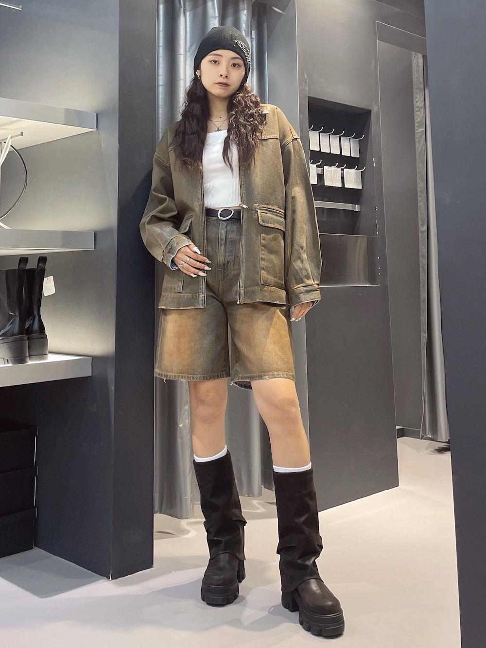 ~ブルゾン~ オーバーサイズに作られているので高身長さんにもオススメ 身長168cmでヒップ3分の2の丈感です 袖口が広めに作られているので中にたくさん着込むことができます 春秋アウターとして大活躍 ~インナー~ スクエアネックでデコルテが綺麗に見え、フェイスラインをすっきり見せてくれます ウエスト部分のリブデザインが細見え効果抜群 1枚で着用しても可愛いオススメ着痩せトップス ~デニム~ トレンドのハーフパンツ 身長168cmでMサイズ着用 Sサイズでも着用できますが、ダボッとよりメンズライクに着用したい方はMサイズがオススメ 太すぎないシルエットが細みえ効果抜群 ~ブーツ~ 25.5cmでLサイズ着用 トレンド感満載のオススメミドルブーツ 素材も柔らかいので履きやすい 高すぎないヒールが高身長さん・厚底初心者さんにもオススメ