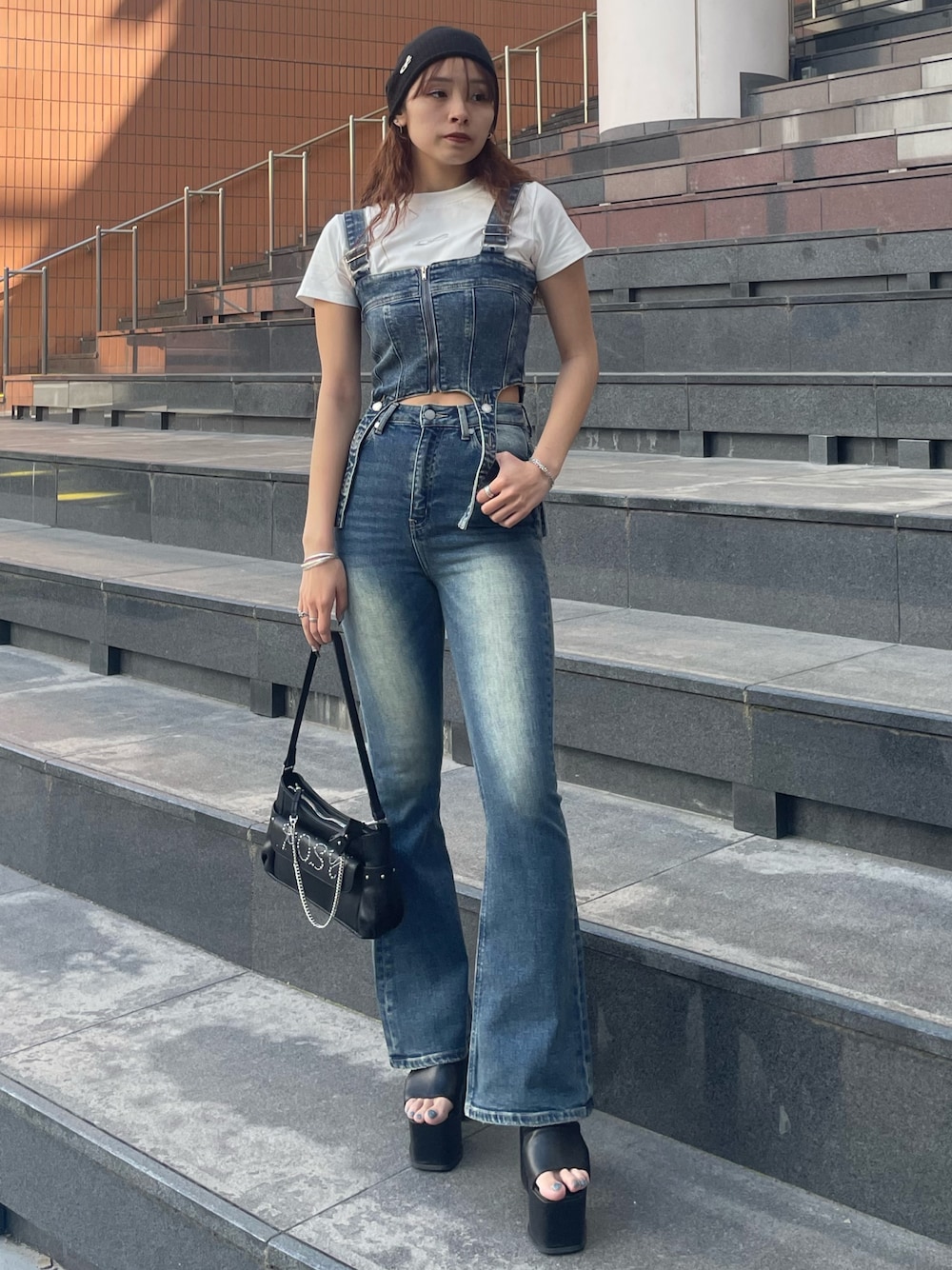 ~サロペット~ 身長168cmでSサイズ着用 肩紐で丈の長さ調節可能 ※写真ではSサイズで肩紐を最大限緩くして着用していますが、高身長さんは圧倒的に丈でMサイズがオススメです また、サロペットがビスチェとデニムで分解できるので上下で着回しも抜群 伸縮性があり履きやすく、ハイウエストでおへそ上にくる丈感になるので脚長効果も抜群です ~インナー~ 身長168cmでおへそ上3cm程の丈感 タイトすぎないサイズ感で着やすい シンプルなデザインで着回し抜群 ショート丈なのでハイウエストのボトムス合わせでスタイルアップ効果抜群 ~サンダル〜 25.5cmでLサイズ着用 厚底なのに傾斜がないため安定感抜群で履きやすい 重すぎないため疲れにくく、長時間着用できます ソックス合わせだと夏だけでなく、春や秋も使えるので着回し抜群 ~バッグ〜 付属チェーンとスタッズが映える人気バッグシンプルなのでどんなコーデにも合わせやすく、オールシーズン使えるのがオススメ マチがしっかりあるので、小型でも使いやすい