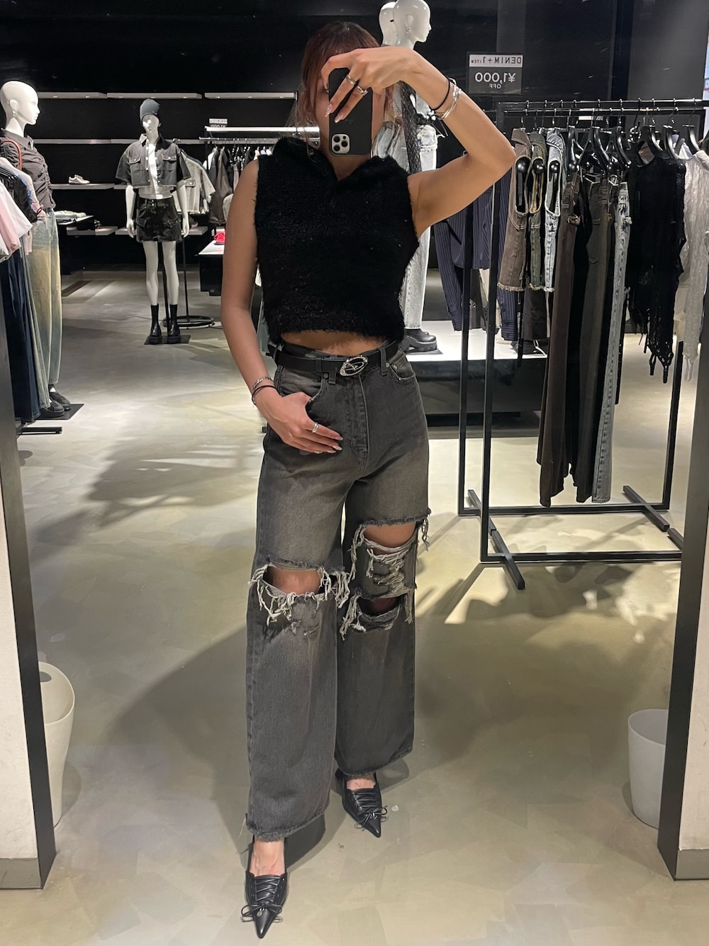 ~トップス〜 身長168cmでおへそ上3cmほどの丈感 短すぎない丈感で高身長さんにもオススメ シャギー素材で肌触りもよく、伸縮性も抜群で着やすいトレンドのフード付きデザインがポイント ~デニム~ 168cmでMサイズ着用 高身長さんは丈でMサイズがオススメ 大胆なクラッシュデザインがトレンド感がありポイント ハイウエストで脚長効果抜群 やり過ぎない肌見せが美脚効果も抜群 ~パンプス〜 25.5cmでLサイズ着用 ヒールが高すぎないので疲れにくい バンドで足首が固定されるので安定感も抜群 トレンドのレースアップデザインが目を引きオススメ