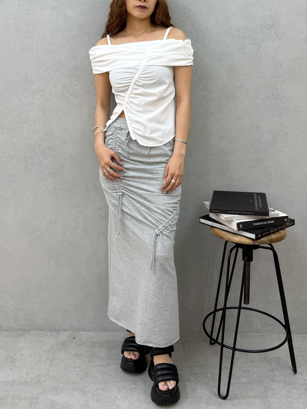 ~トップス〜 サラサラとした生地感で着やすく夏にもオススメ タイトすぎないサイズ感で伸縮性があり着やすい 肩紐のアジャスターは調節・取り外し可能 丈が短すぎないので高身長さんでも着やすい デコルテがスッキリ見えるので小顔効果が期待できるのと、ウエスト部分のさり気ない肌見せで細見え効果抜群 ~スカート~ 丈が長めなので高身長さんにもオススメ ウエストがゴムになっているので伸縮性抜群で履きやすい タイトすぎないシルエットとギャザーのドロストデザインが細見え効果抜群 後ろにスリットが入ってるので、さり気ない肌見せで女性らしさアップ ~サンダル〜 リアルバイ超オススメサンダル 25.5cmでLサイズ着用 柔らかいクッション素材なので履きやすさ抜群 高すぎない厚底と傾斜がないので安定感も抜群 シンプルだけど存在感のあるデザインでポイントにもなり、どんなコーデにも合わせやすいです