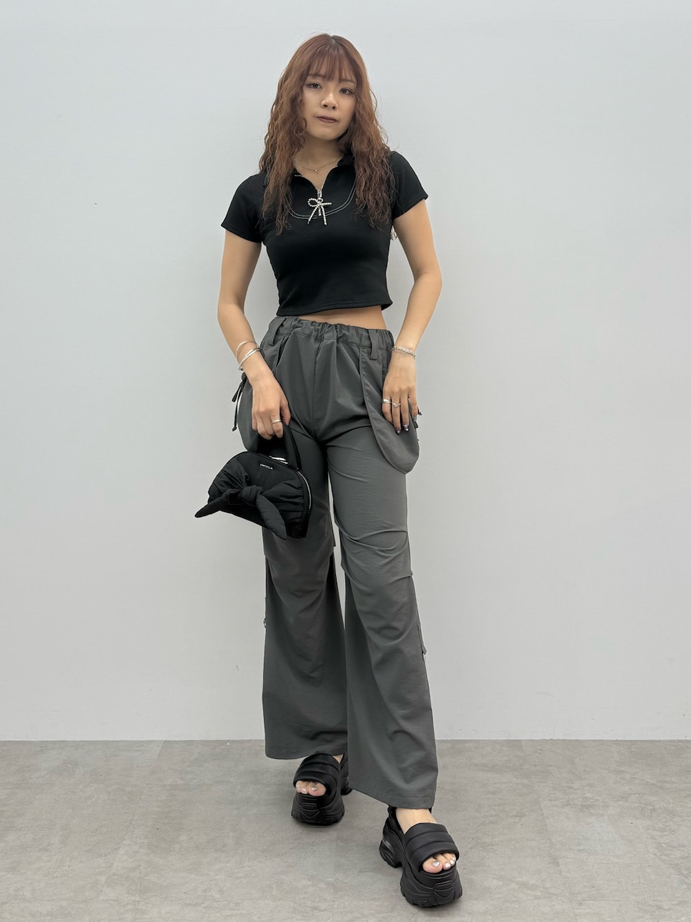 ~トップス~ パールリボンがポイントのトレンド感あるトップス スポーティーなデザインですが、リボンやジップでカジュアルすぎないモードな雰囲気で着用できます 丈も短すぎないので高身長さんにもオススメ 伸縮性抜群でサラッとした生地感なので着やすいです 〜パンツ〜 身長168cmでしっかり踵が隠れる丈感なので高身長さんにもオススメ ナイロン素材でサラサラしているので夏も着やすい アウトポケットデザインが腰周りをカバーしてくれます 太すぎないストレートめなシルエットとギャザーデザインで細見え効果抜群 ~サンダル〜 25.5cmでLサイズ着用 柔らかいクッション素材なので履きやすさ抜群 高すぎない厚底と傾斜がないので安定感も抜群 シンプルだけど存在感のあるデザインでポイントにもなり、どんなコーデにも合わせやすいです 〜バッグ〜 トレンドのリボンがポイントのバッグ ナイロン素材なのとチェーンショルダーになっているので甘すぎないモードカジュアルな印象になります ハンドバッグとショルダーバッグの2wayで使用可能 コンパクトなサイズ感ですがマチがしっかりとあるので使いやすいです
